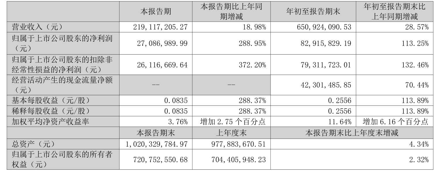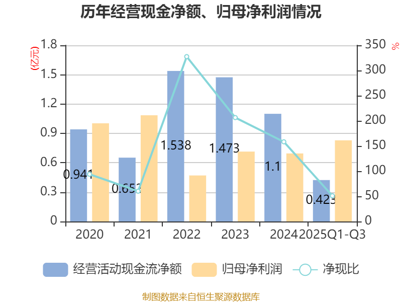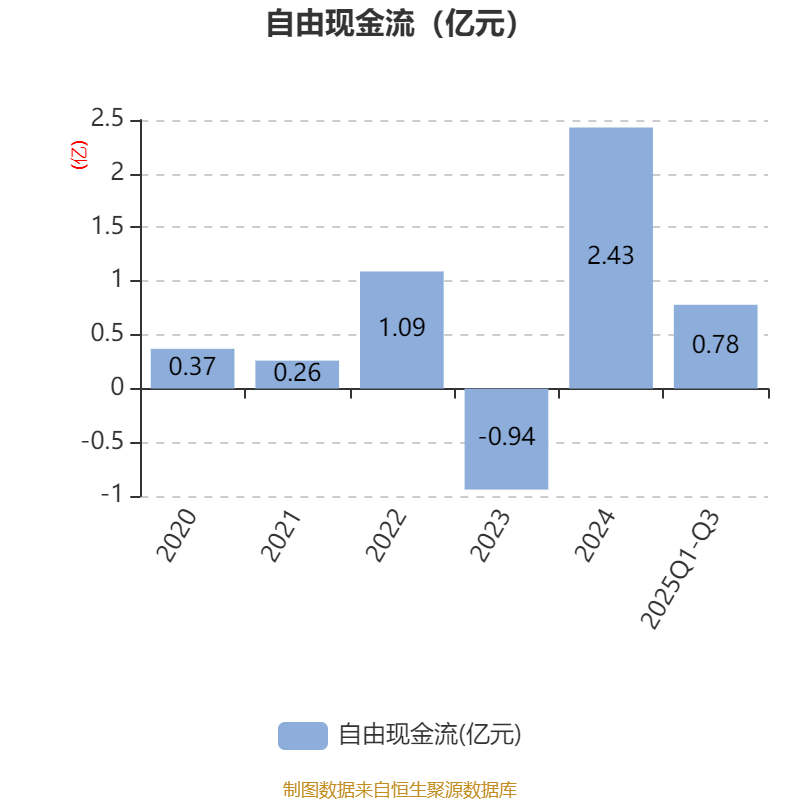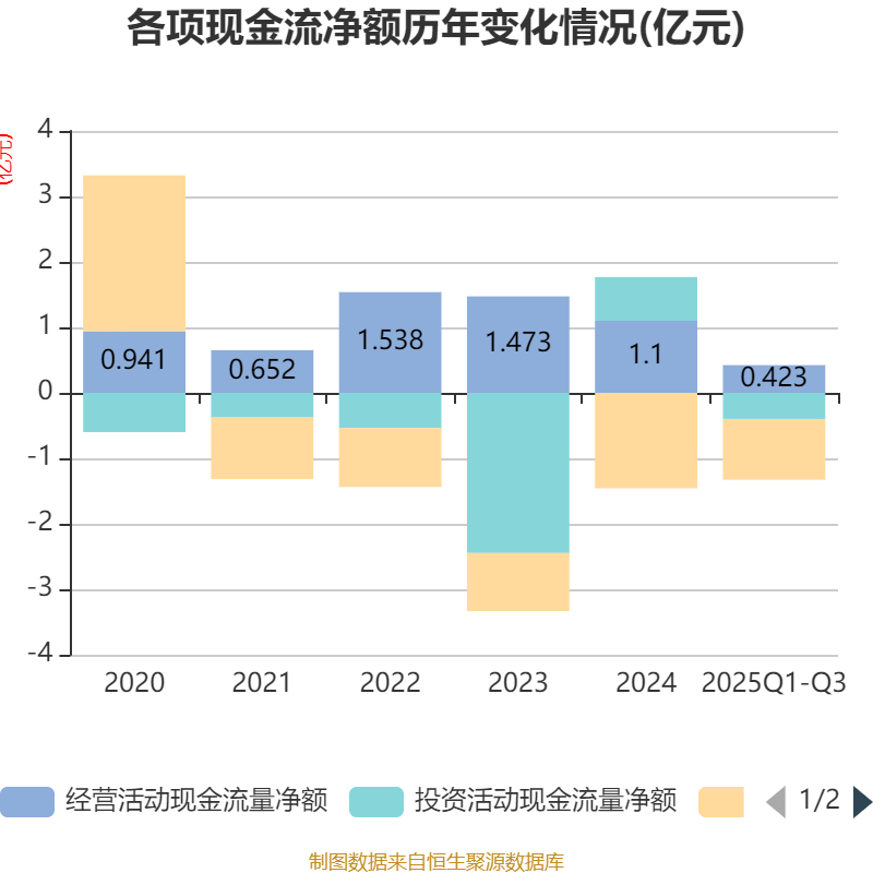 2025年前三季度,公司经营活动现金流净额为4230.15万元,同比增长70.44%;筹资活动现金流净额-9279.47万元,同比增加4609.54万元;投资活动现金流净额-3989.05万元,上年同期为1.43亿元。