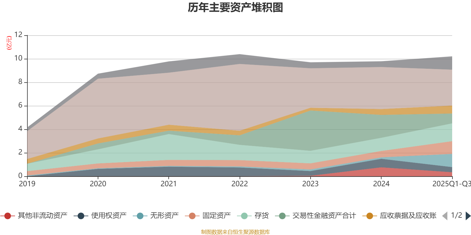 资产重大变化方面,截至2025年三季度末,公司交易性金融资产合计较上年末减少56.74%,占公司总资产比重下降11.67个百分点;无形资产较上年末增加825.85%,占公司总资产比重上升9.79个百分点;货币资金较上年末减少14.62%,占公司总资产比重下降6.65个百分点;固定资产较上年末增加99.44%,占公司总资产比重上升5.06个百分点。