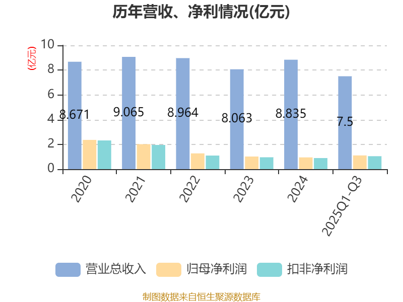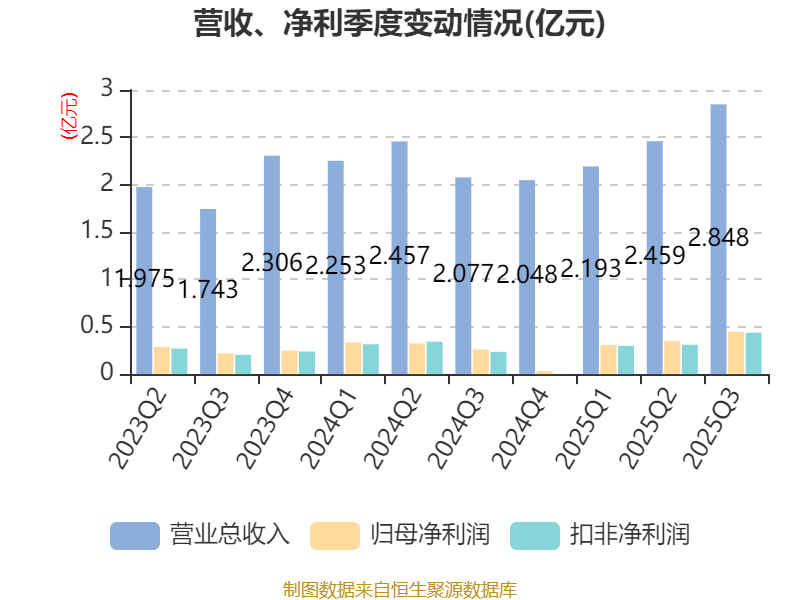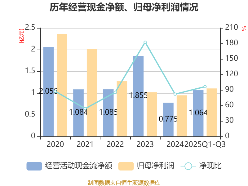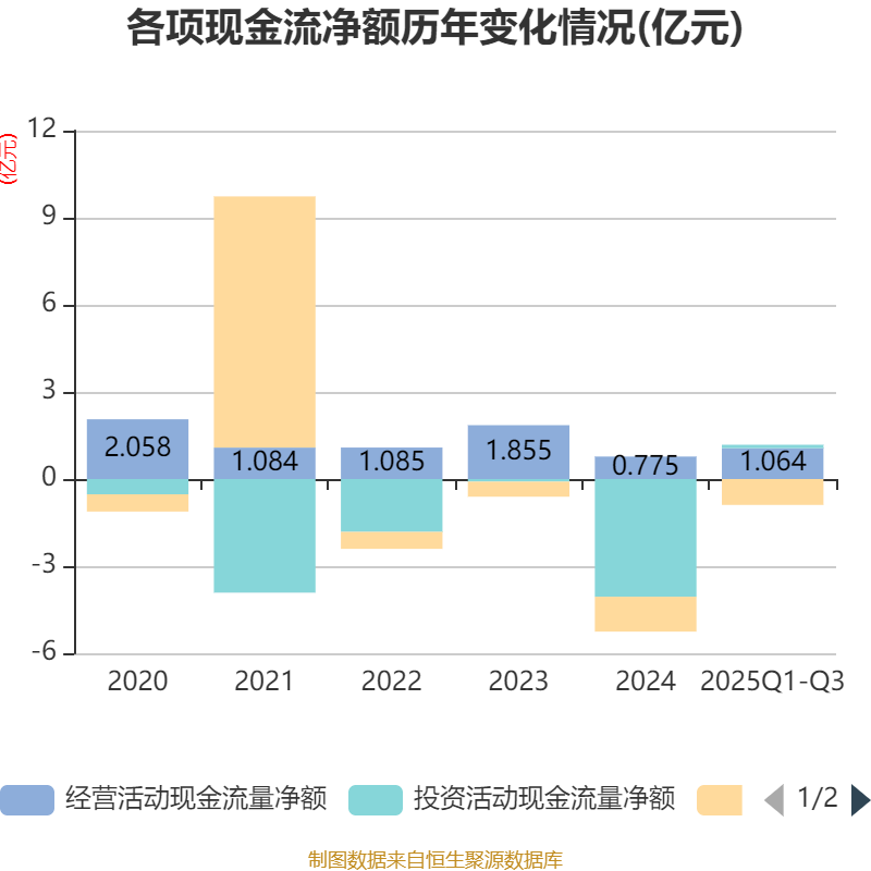 2025年前三季度,公司经营活动现金流净额为1.06亿元,同比增长54.06%;筹资活动现金流净额-8908.59万元,同比增加3105.94万元;投资活动现金流净额1174.19万元,上年同期为-2.27亿元。
