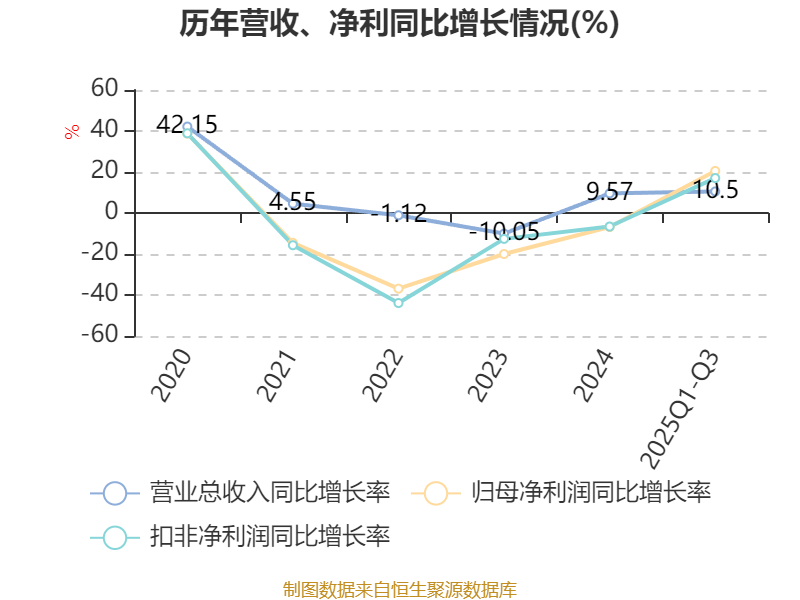 中证智能财讯长龄液压(605389)10月24日披露2025年第三季度报告。前三季度公司实现营业总收入7.5亿元,同比增长10.50%;归母净利润1.1亿元,同比增长20.51%;扣非净利润1.04亿元,同比增长17.04%;经营活动产生的现金流量净额为1.06亿元,同比增长54.06%;报告期内,长龄液压基本每股收益为0.77元,加权平均净资产收益率为5.19%。