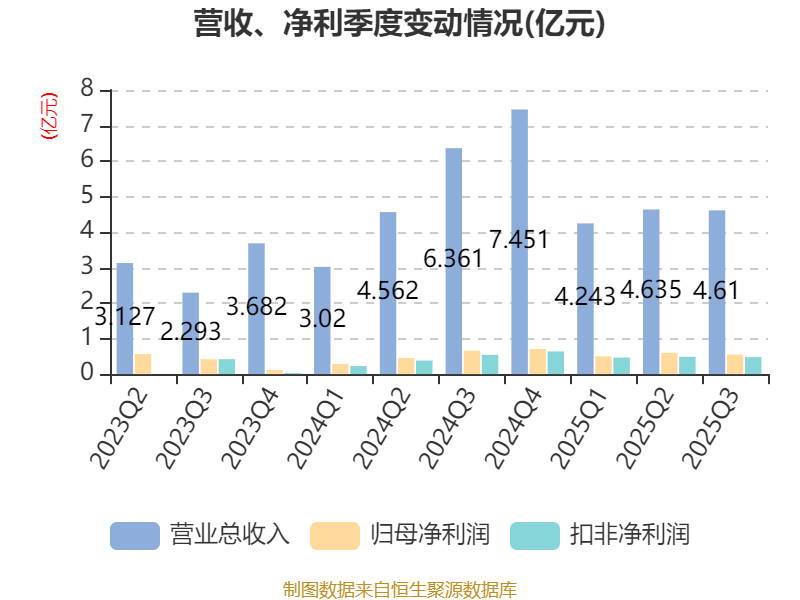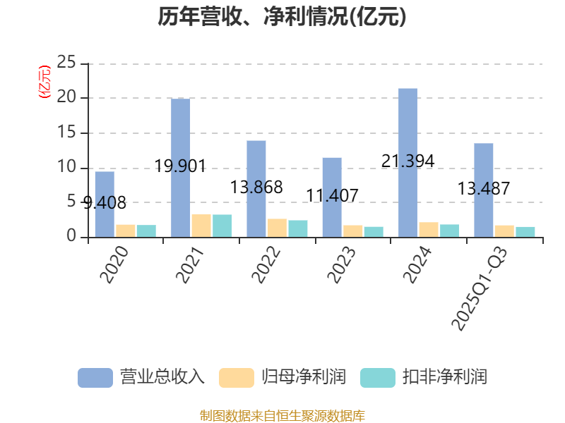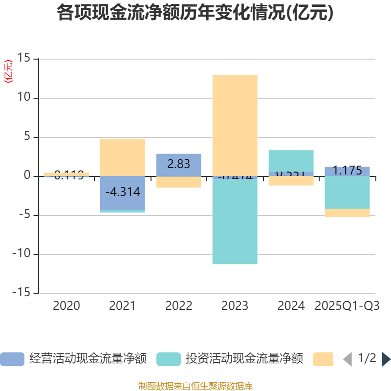 2025年前三季度,公司经营活动现金流净额为1.18亿元,同比增加2.66亿元;筹资活动现金流净额-1.04亿元,同比增加6042.83万元;投资活动现金流净额-4.21亿元,上年同期为1.6亿元。