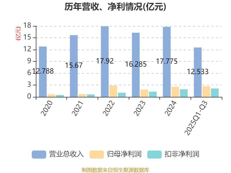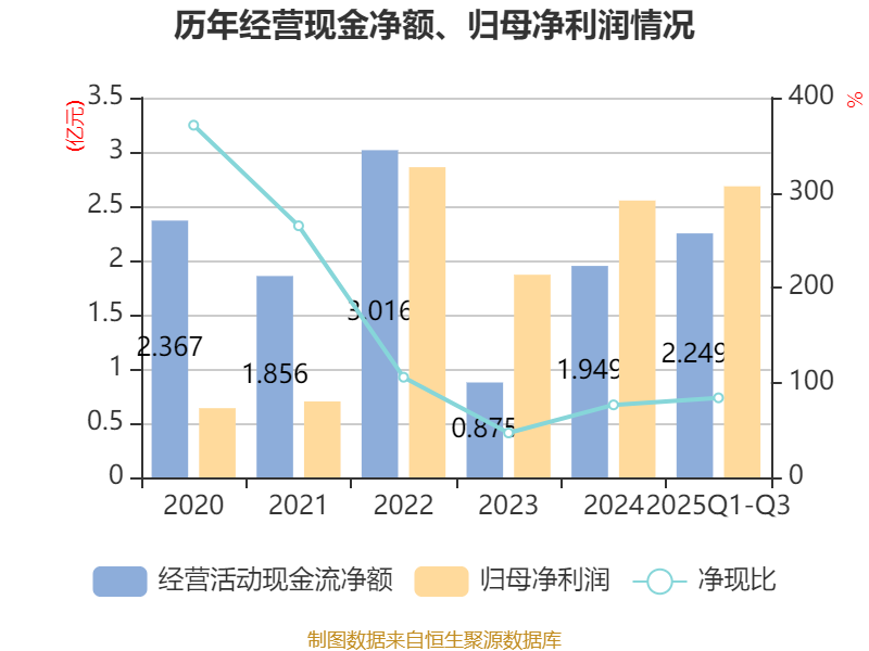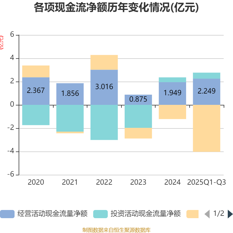 2025年前三季度,公司经营活动现金流净额为2.25亿元,同比增长92.22%;筹资活动现金流净额-4.03亿元,同比减少3.21亿元;投资活动现金流净额5163万元,上年同期为-3772.2万元。