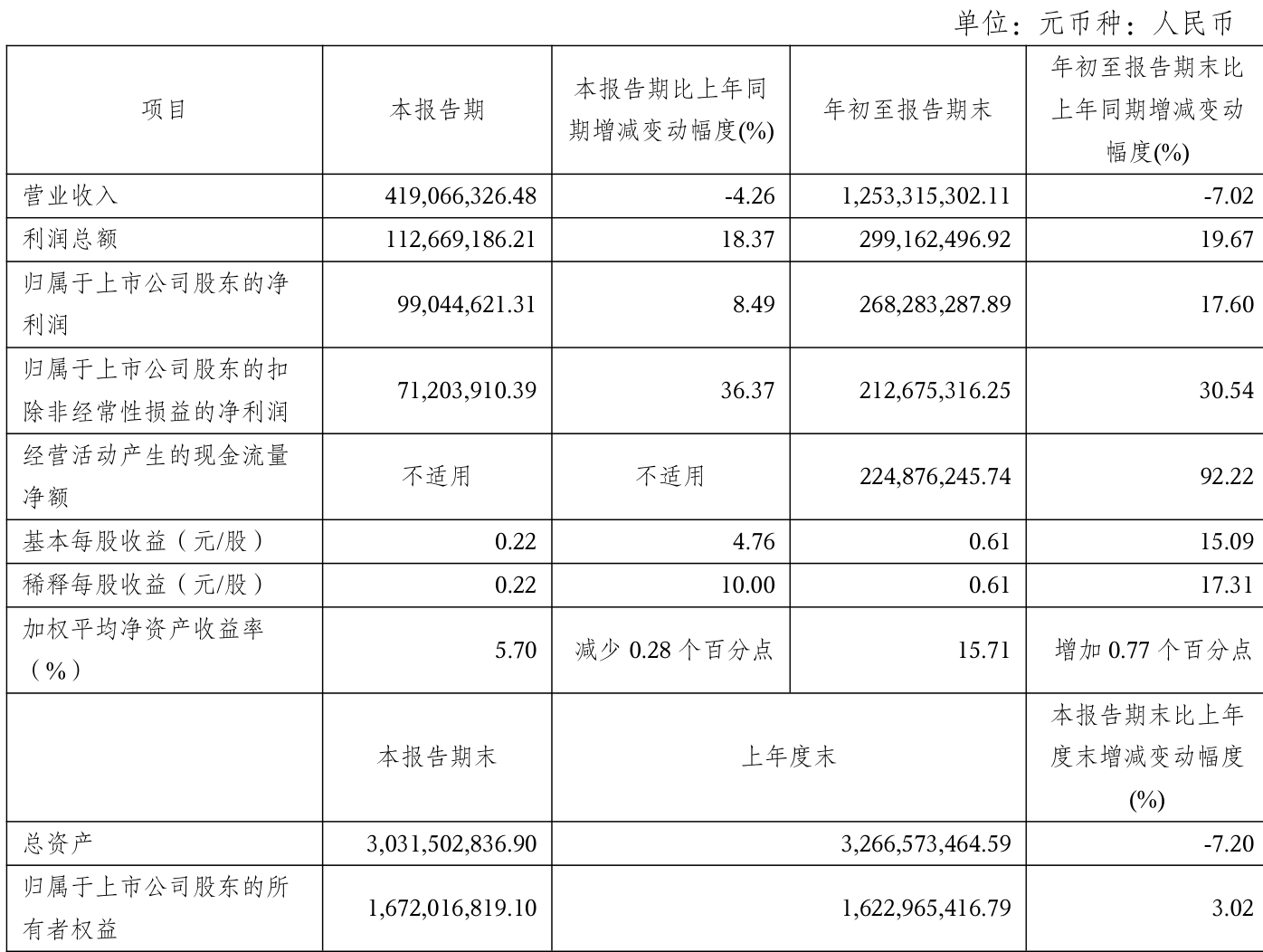 中证智能财讯方盛制药(603998)10月24日披露2025年第三季度报告。前三季度公司实现营业总收入12.53亿元,同比下降7.02%;归母净利润2.68亿元,同比增长17.60%;扣非净利润2.13亿元,同比增长30.54%;经营活动产生的现金流量净额为2.25亿元,同比增长92.22%;报告期内,方盛制药基本每股收益为0.61元,加权平均净资产收益率为15.71%。