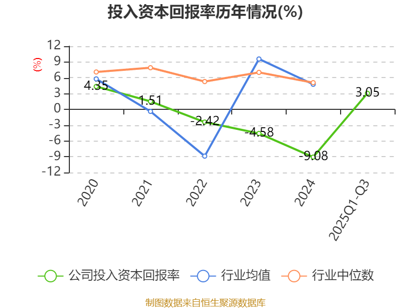 盈利能力方面, 2025年前三季度公司加权平均净资产收益率为3.55%,同比上升5.76个百分点。公司2025年前三季度投入资本回报率为3.05%,较上年同期上升5.6个百分点。
