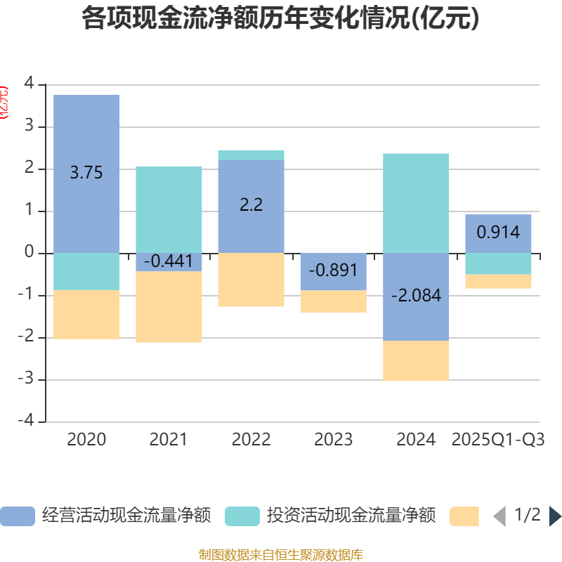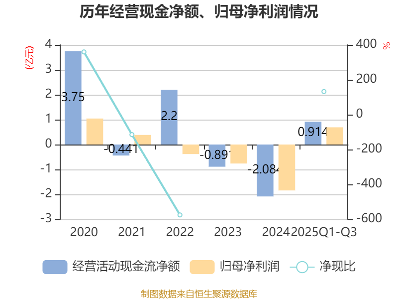 2025年前三季度,公司经营活动现金流净额为9143.16万元,同比增加2.24亿元;筹资活动现金流净额-3321.63万元,同比增加3824.1万元;投资活动现金流净额-5112万元,上年同期为1.86亿元。