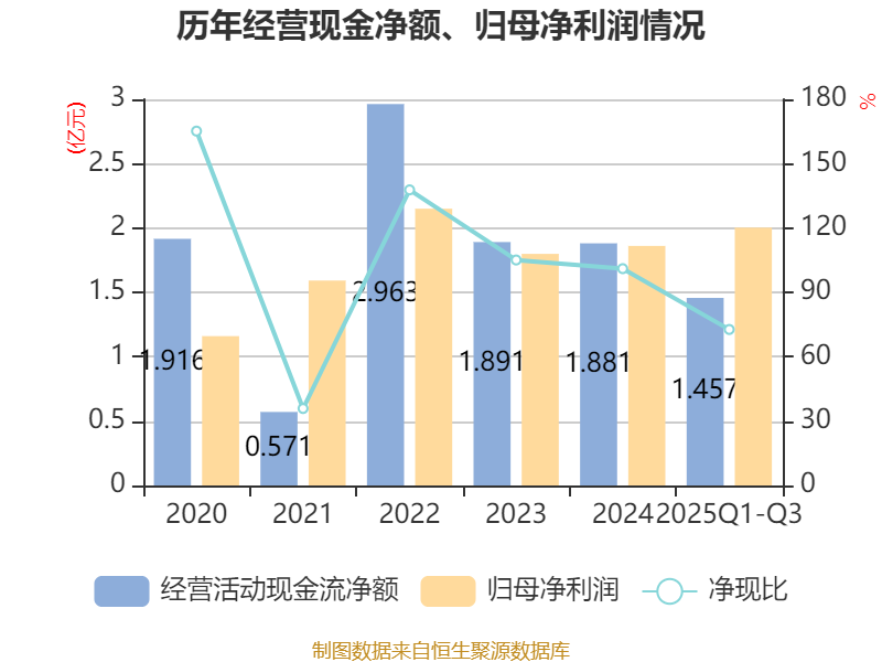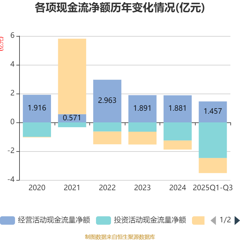 2025年前三季度,公司经营活动现金流净额为1.46亿元,同比增长217.23%;筹资活动现金流净额-1.05亿元,同比减少4216.84万元;投资活动现金流净额-2.47亿元,上年同期为-8383.7万元。
