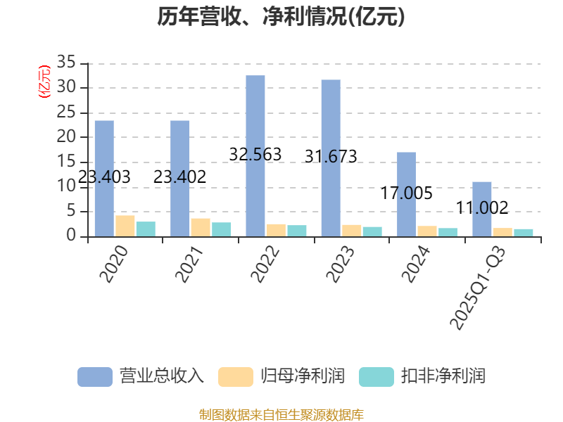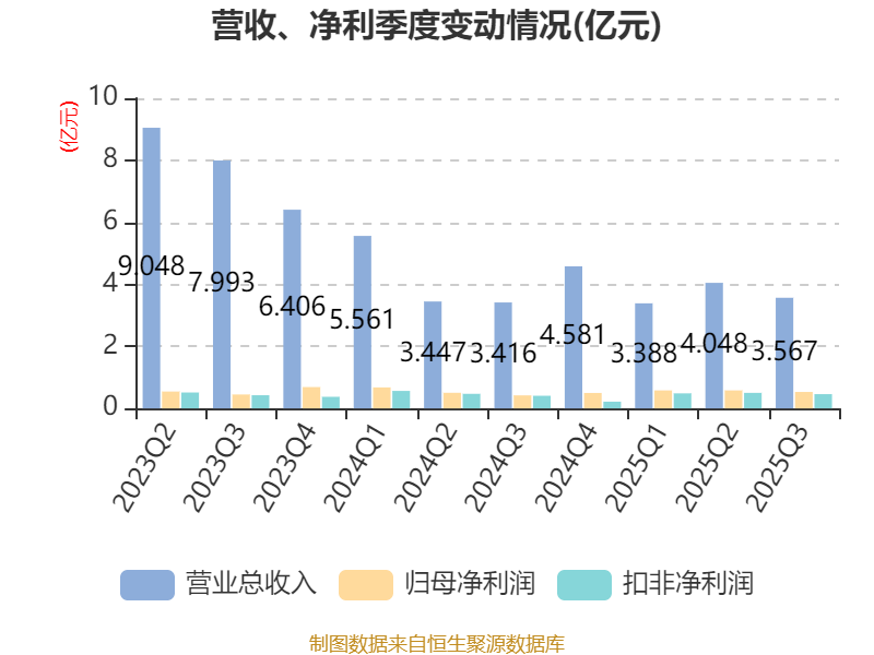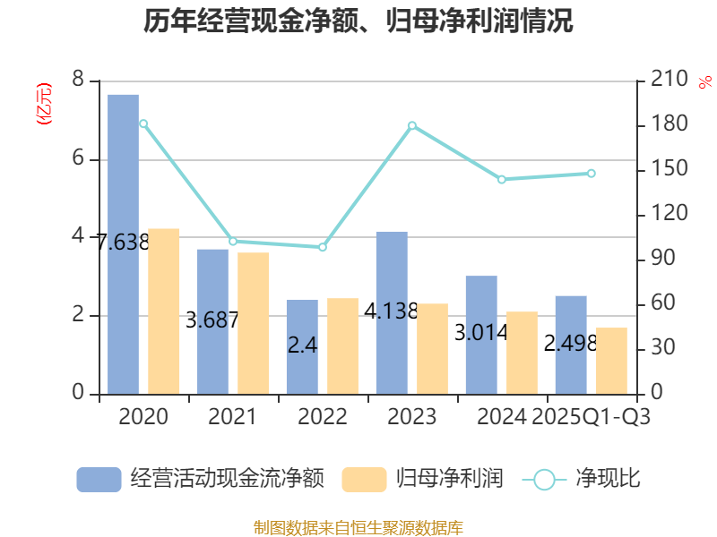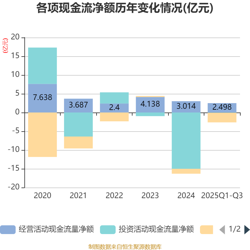 2025年前三季度,公司经营活动现金流净额为2.5亿元,同比增长47.77%;筹资活动现金流净额-2.57亿元,同比减少1.3亿元;投资活动现金流净额-652.47万元,上年同期为-14.2亿元。
