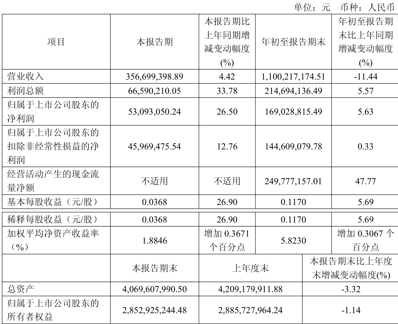 中证智能财讯宁波富达(600724)10月24日披露2025年第三季度报告。前三季度公司实现营业总收入11亿元,同比下降11.44%;归母净利润1.69亿元,同比增长5.63%;扣非净利润1.45亿元,同比增长0.33%;经营活动产生的现金流量净额为2.5亿元,同比增长47.77%;报告期内,宁波富达基本每股收益为0.117元,加权平均净资产收益率为5.82%。