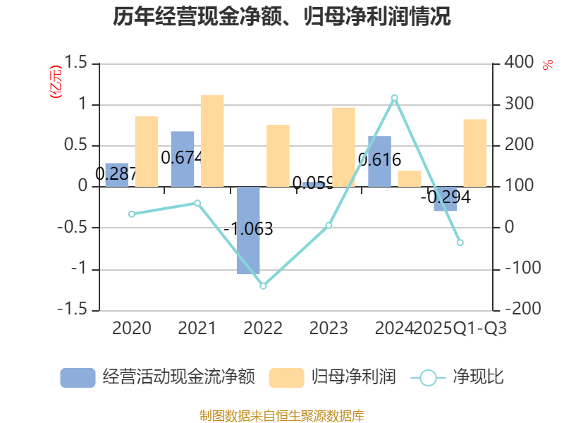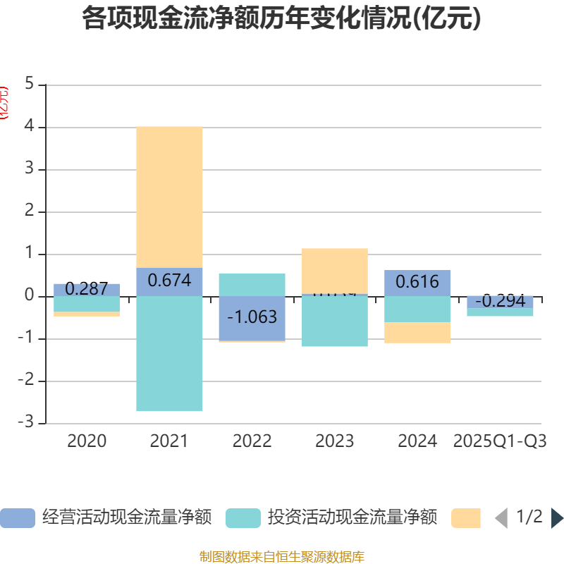 2025年前三季度,公司经营活动现金流净额为-2938.33万元,同比减少6041.62万元;筹资活动现金流净额182.01万元,同比增加7167.43万元;投资活动现金流净额-1798.12万元,上年同期为-5550.05万元。