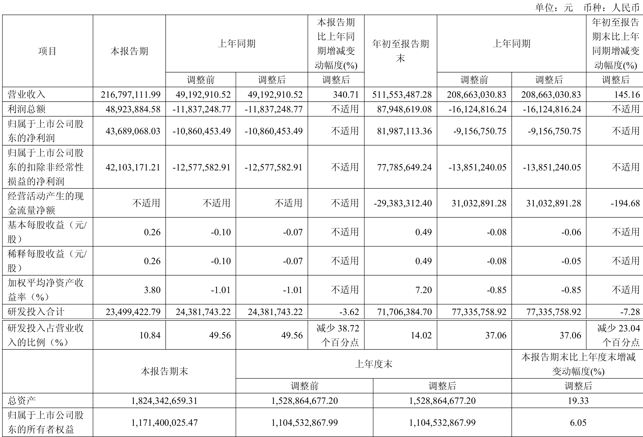 中证智能财讯智明达(688636)10月24日披露2025年第三季度报告。前三季度公司实现营业总收入5.12亿元,同比增长145.16%;归母净利润8198.71万元,同比扭亏;扣非净利润7778.56万元,同比扭亏;经营活动产生的现金流量净额为-2938.33万元,上年同期为3103.29万元;报告期内,智明达基本每股收益为0.49元,加权平均净资产收益率为7.20%。