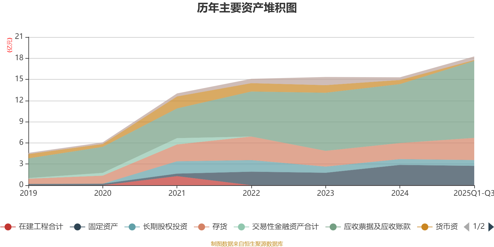 资产重大变化方面,截至2025年三季度末,公司应收票据及应收账款较上年末增加30.6%,占公司总资产比重上升5.15个百分点;固定资产较上年末减少4.75%,占公司总资产比重下降3.8个百分点;货币资金较上年末减少80.19%,占公司总资产比重下降3.16个百分点;存货较上年末增加37.43%,占公司总资产比重上升2.27个百分点。