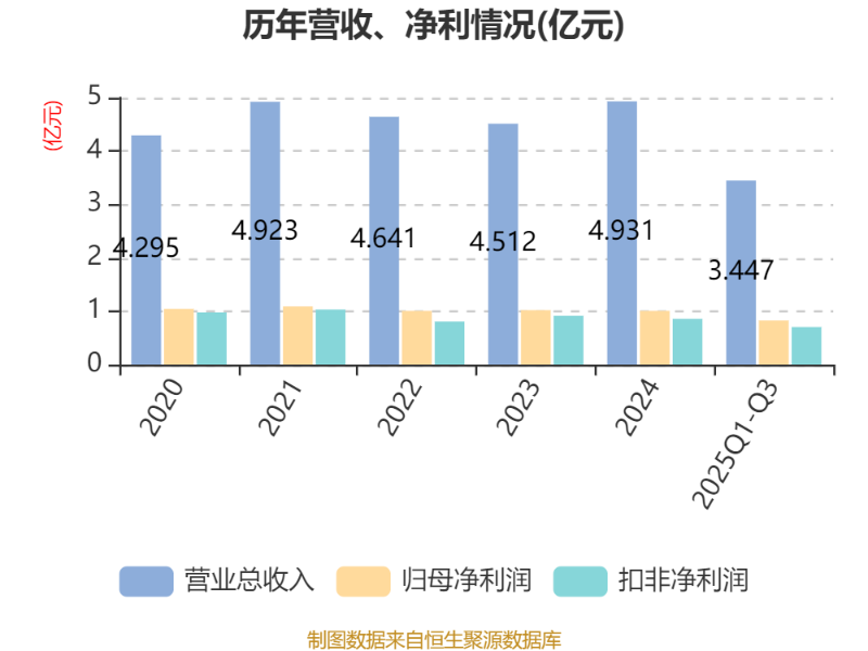 中证智能财讯宁波色母(301019)10月24日披露2025年第三季度报告。前三季度公司实现营业总收入3.45亿元,同比下降5.93%;归母净利润8250.64万元,同比增长15.12%;扣非净利润7036.21万元,同比增长14.46%;经营活动产生的现金流量净额为7939.96万元,同比增长37.92%;报告期内,宁波色母基本每股收益为0.5元,加权平均净资产收益率为7.48%。