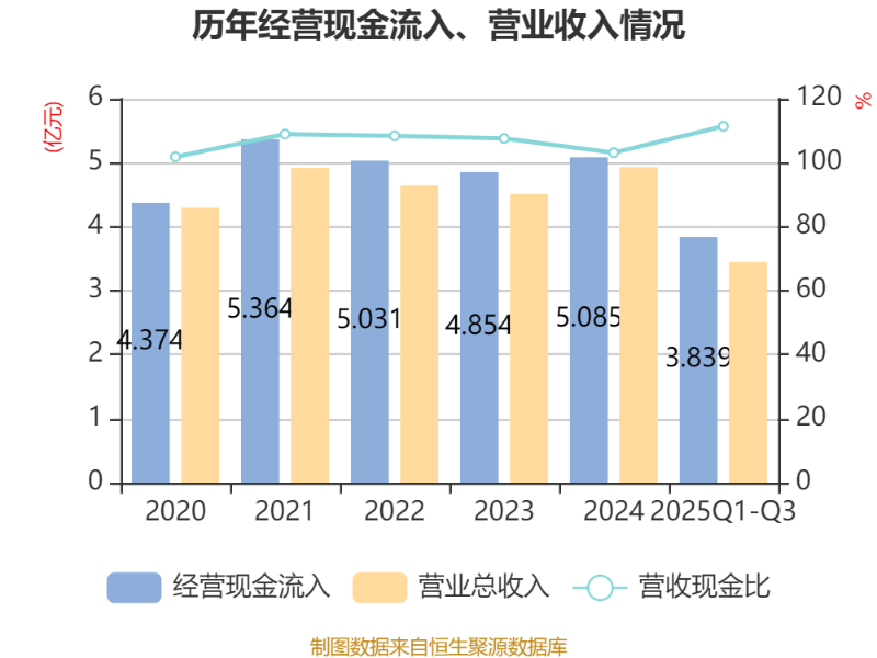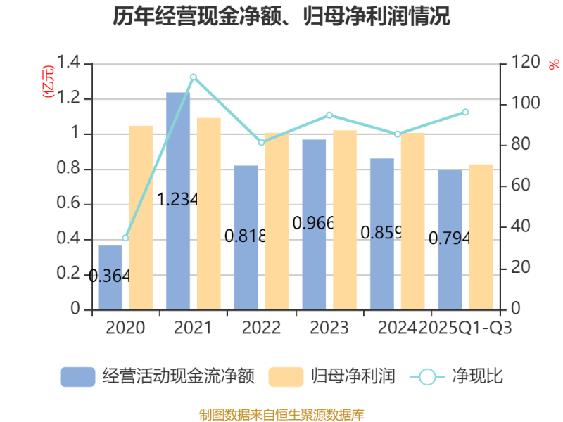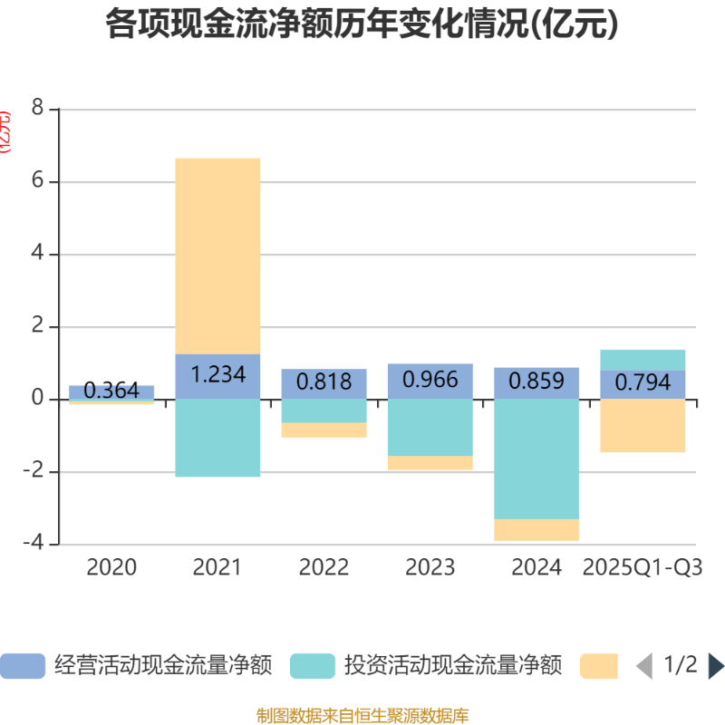 2025年前三季度,公司经营活动现金流净额为7939.96万元,同比增长37.92%;筹资活动现金流净额-1.48亿元,同比减少8738.17万元;投资活动现金流净额5567.4万元,上年同期为-3.27亿元。