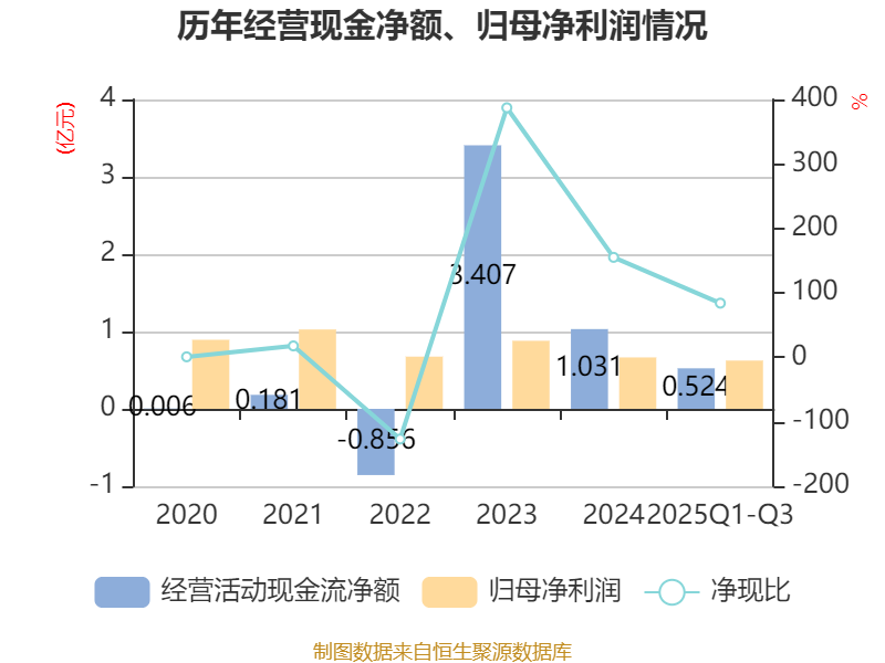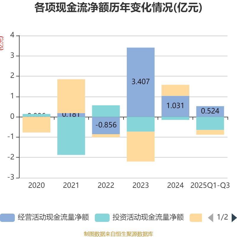 2025年前三季度,公司经营活动现金流净额为5240.45万元,同比增长34.75%;筹资活动现金流净额-2327.69万元,同比减少6271.15万元;投资活动现金流净额-6476.07万元,上年同期为-553.69万元。