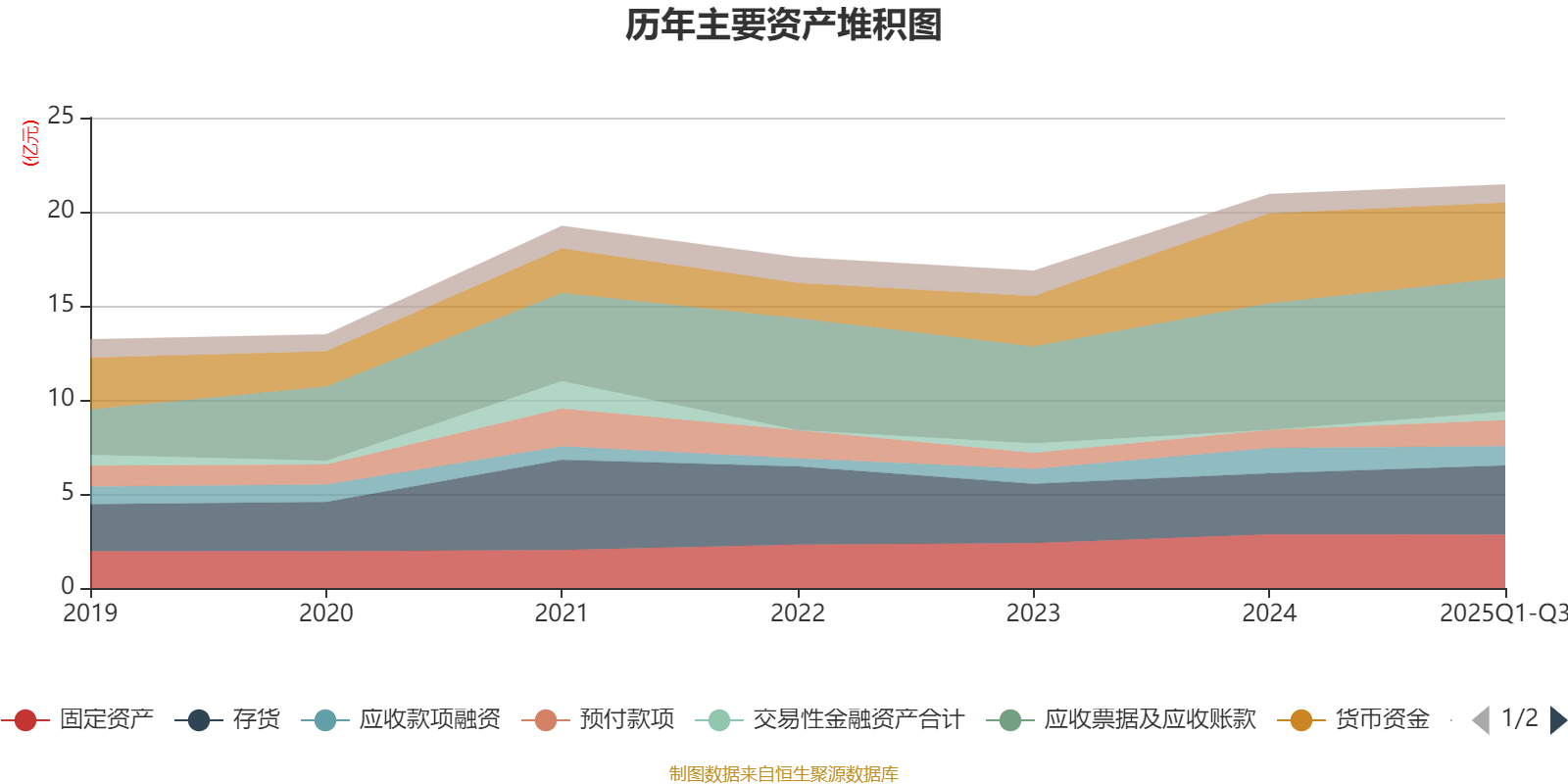 资产重大变化方面,截至2025年三季度末,公司货币资金较上年末减少16.1%,占公司总资产比重下降4.13个百分点;交易性金融资产合计占公司总资产的2.06%,上年末为0;预付款项较上年末增加44.23%,占公司总资产比重上升1.86个百分点;存货较上年末增加13.4%,占公司总资产比重上升1.65个百分点。