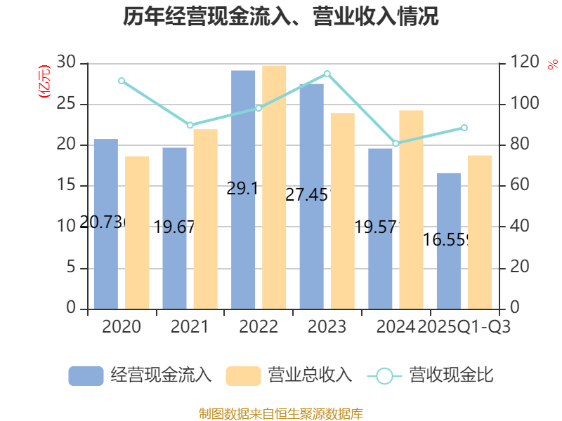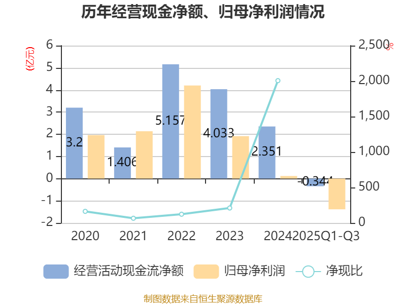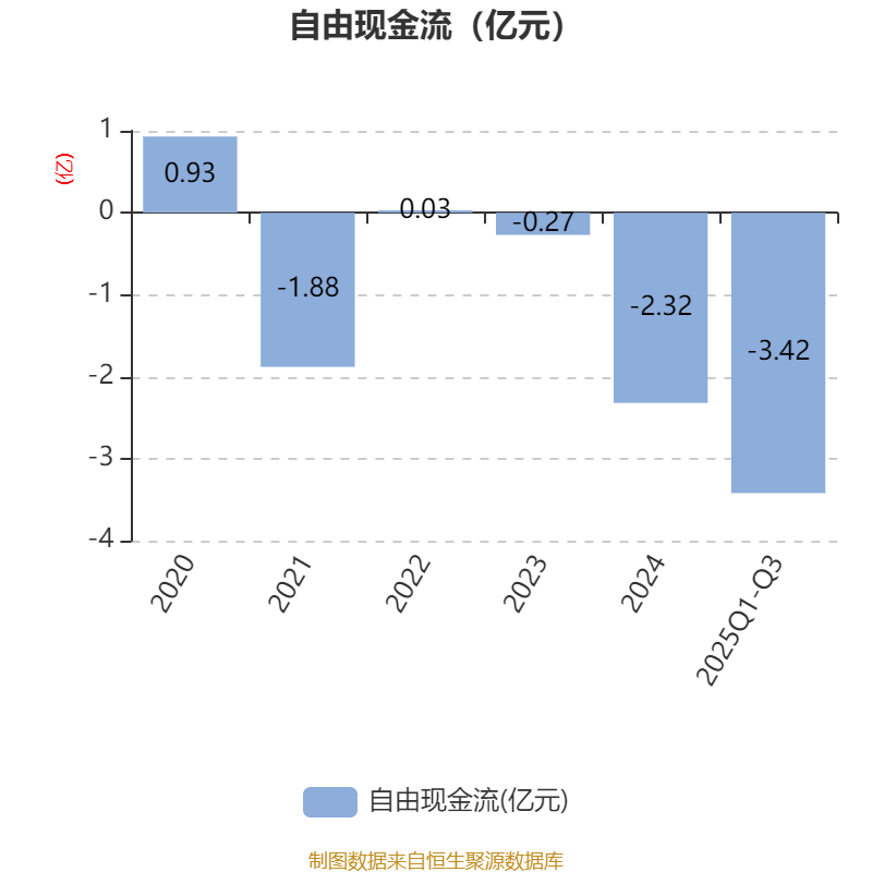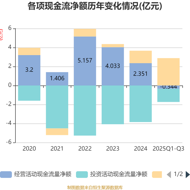 2025年前三季度,公司经营活动现金流净额为-3436.01万元,同比减少1.94亿元;筹资活动现金流净额2.88亿元,同比增加2.29亿元;投资活动现金流净额-1.39亿元,上年同期为-2.13亿元。