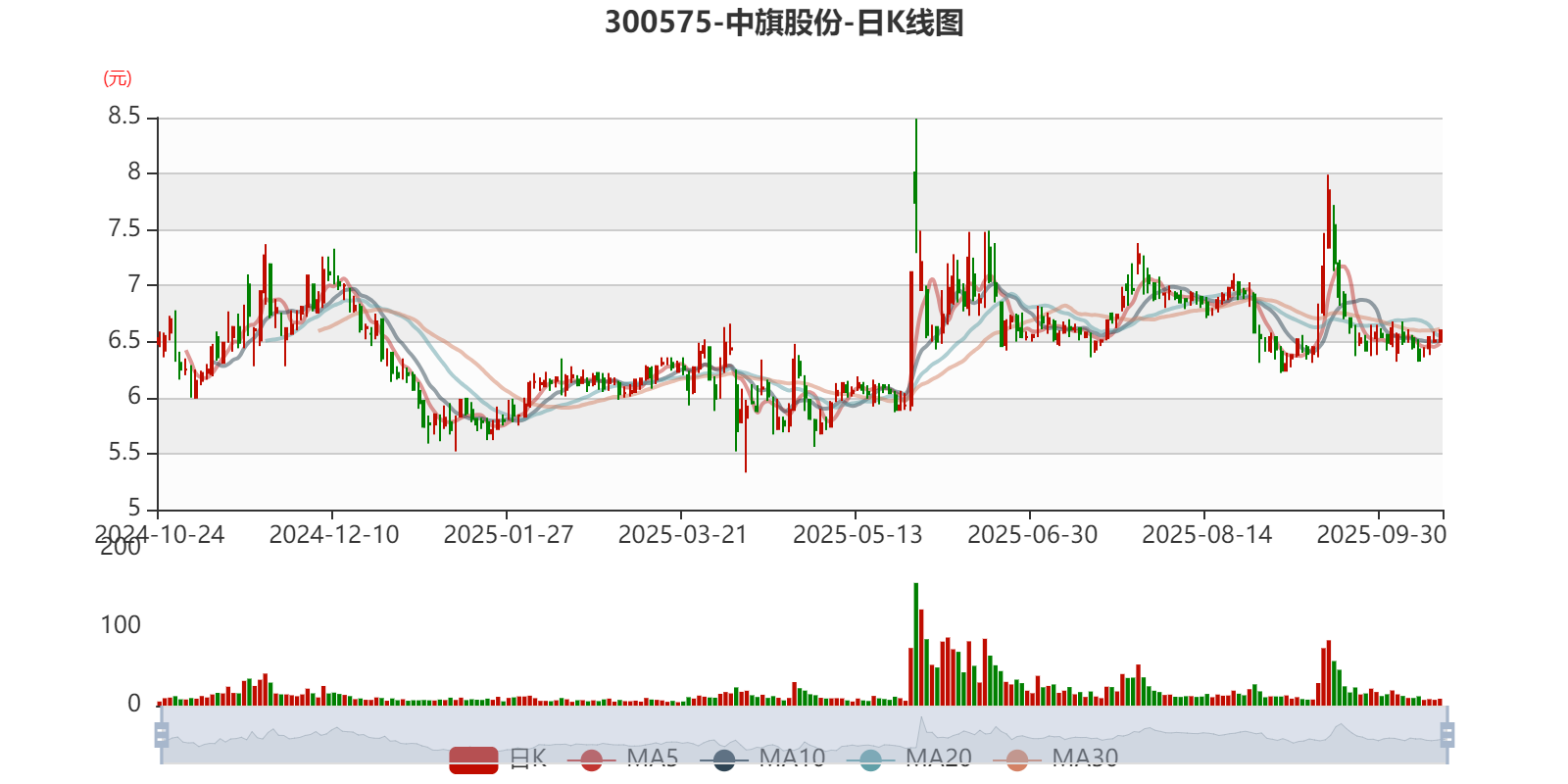中证智能财讯中旗股份(300575)10月24日披露2025年第三季度报告。前三季度公司实现营业总收入18.72亿元,同比增长5.23%;归母净利润亏损1.38亿元,上年同期盈利2651.76万元;扣非净利润亏损1.42亿元,上年同期盈利2876.28万元;经营活动产生的现金流量净额为-3436.01万元,上年同期为1.59亿元;报告期内,中旗股份基本每股收益为-0.29元,加权平均净资产收益率为-6.78%。