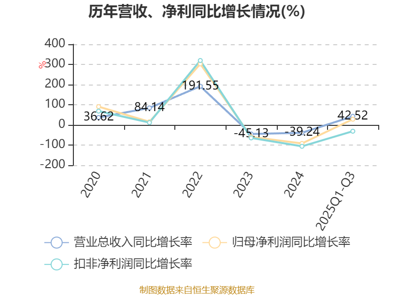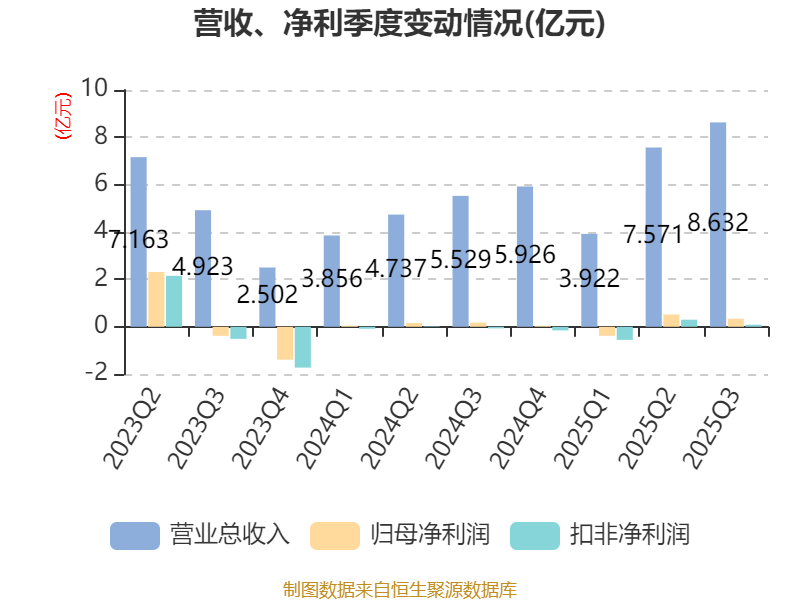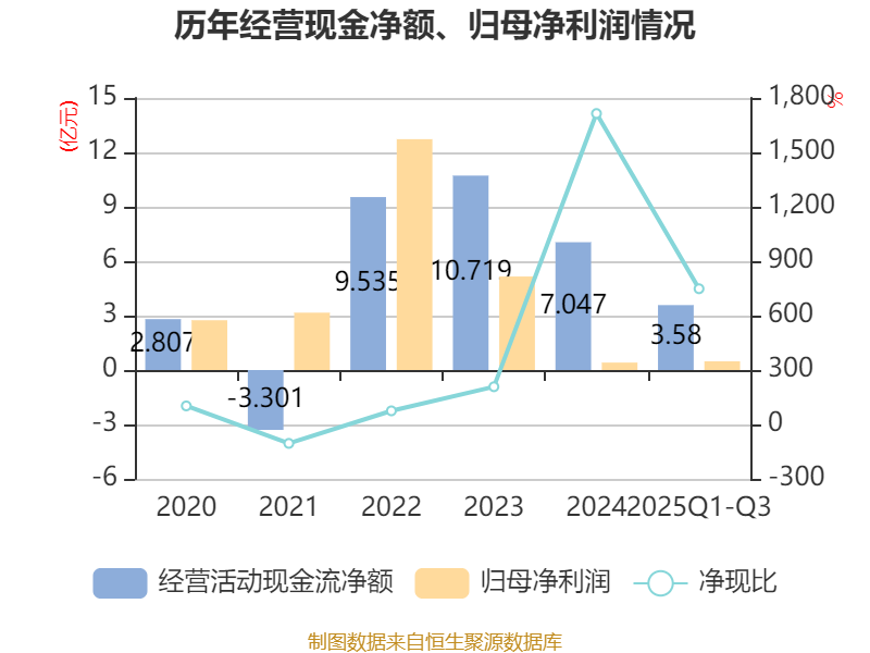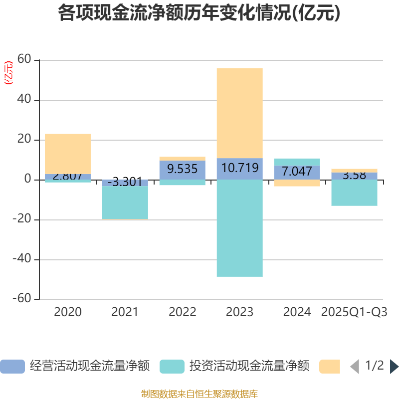2025年前三季度,公司经营活动现金流净额为3.58亿元,同比下降46.86%;筹资活动现金流净额1.77亿元,同比增加5.74亿元;投资活动现金流净额-13.18亿元,上年同期为1.98亿元。