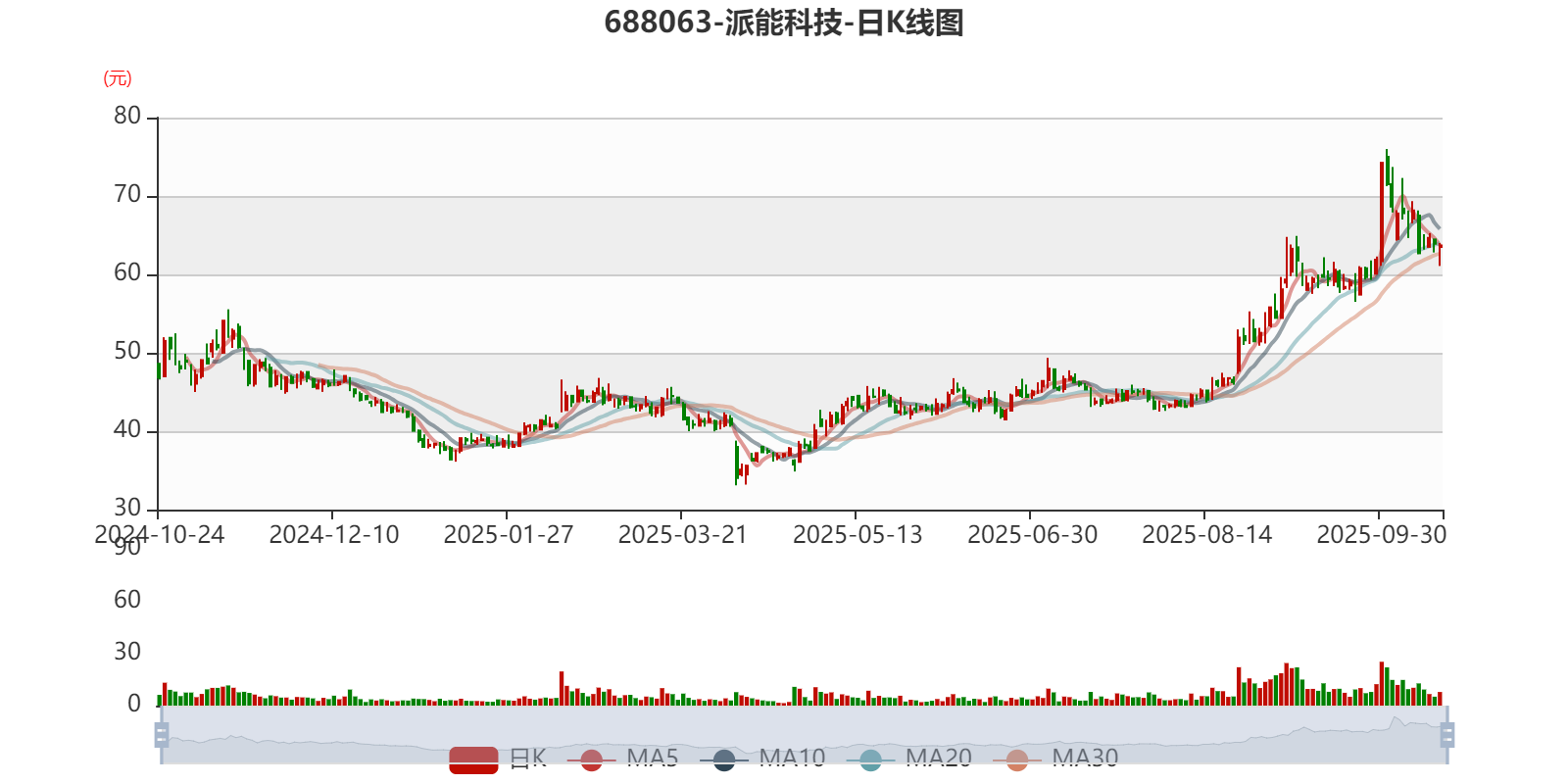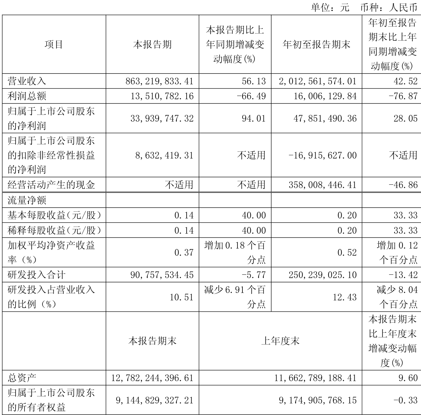 中证智能财讯派能科技(688063)10月24日披露2025年第三季度报告。前三季度公司实现营业总收入20.13亿元,同比增长42.52%;归母净利润4785.15万元,同比增长28.05%;扣非净利润亏损1691.56万元,上年同期亏损1287.38万元;经营活动产生的现金流量净额为3.58亿元,同比下降46.86%;报告期内,派能科技基本每股收益为0.2元,加权平均净资产收益率为0.52%。