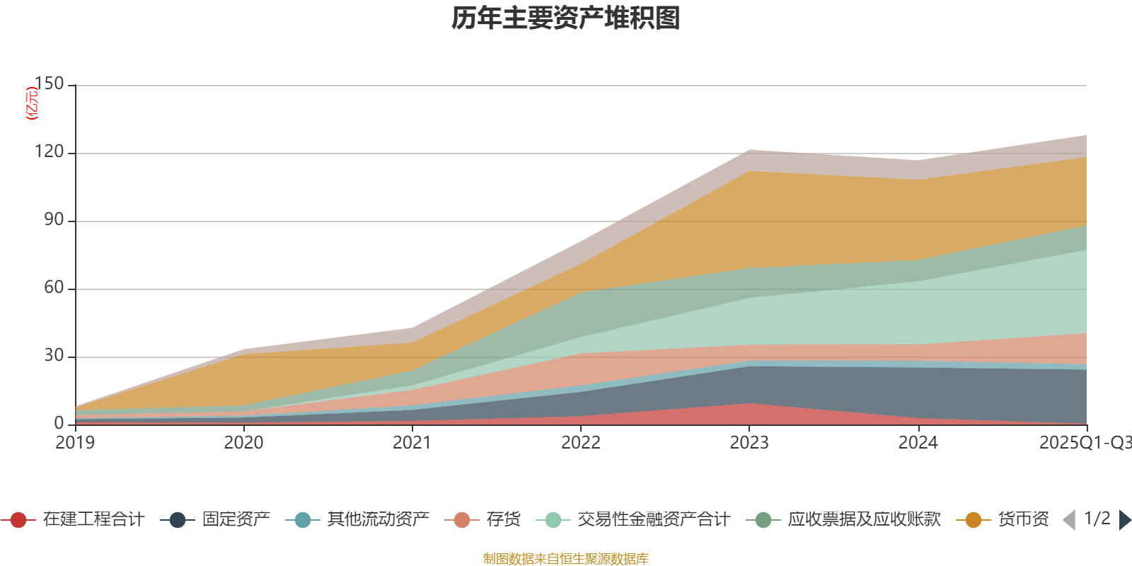 资产重大变化方面,截至2025年三季度末,公司货币资金较上年末减少14.83%,占公司总资产比重下降6.76个百分点;交易性金融资产合计较上年末增加31.93%,占公司总资产比重上升4.87个百分点;存货较上年末增加90.38%,占公司总资产比重上升4.55个百分点;在建工程合计较上年末减少88.8%,占公司总资产比重下降2.14个百分点。