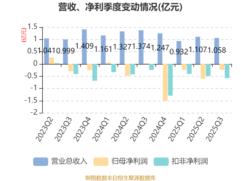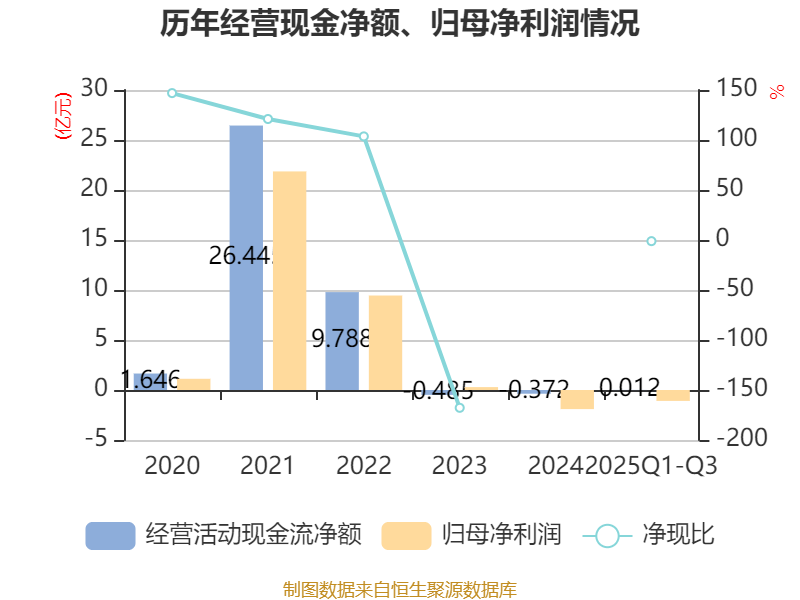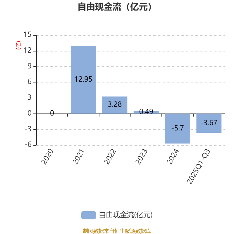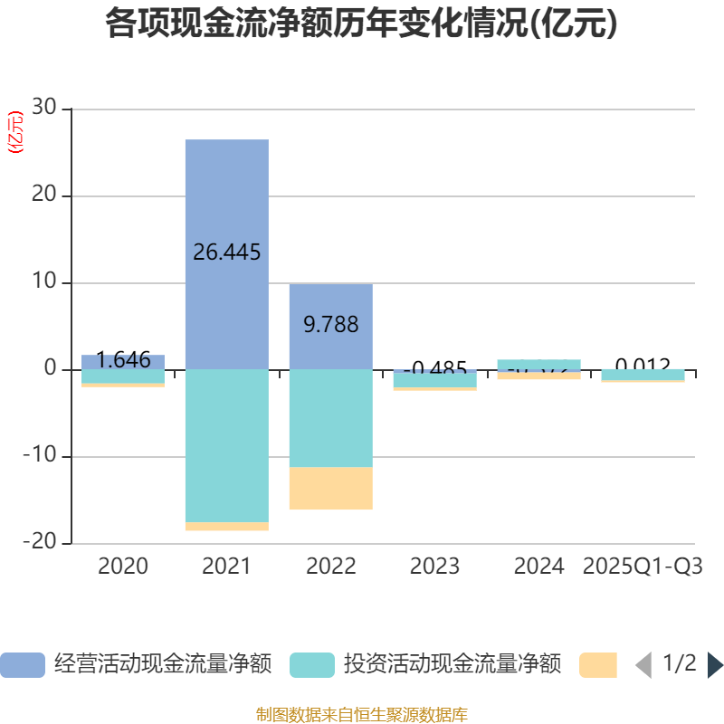 2025年前三季度,公司经营活动现金流净额为124.6万元,同比增加1082.1万元;筹资活动现金流净额-1966.27万元,同比增加4770.52万元;投资活动现金流净额-1.3亿元,上年同期为-1.27亿元。