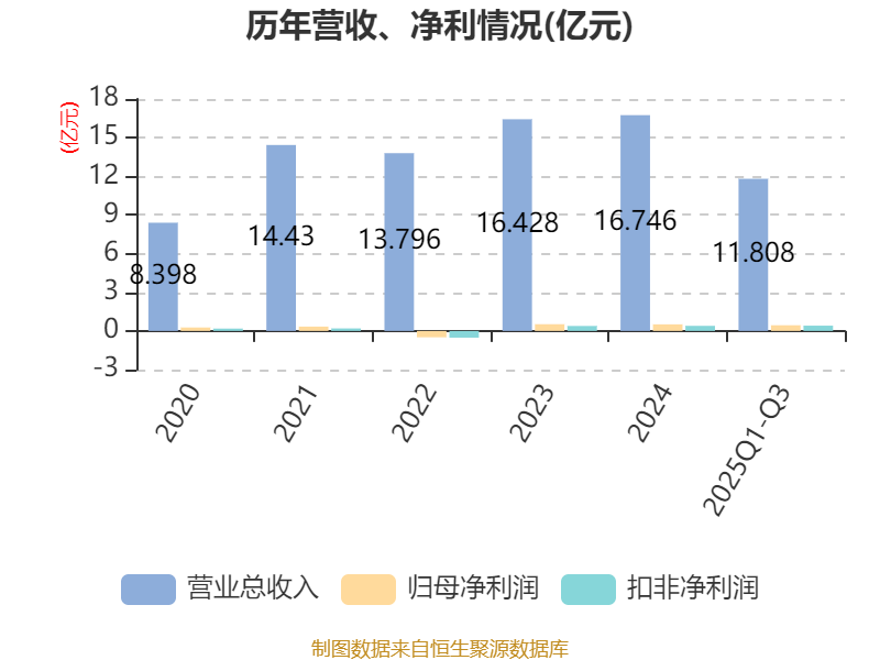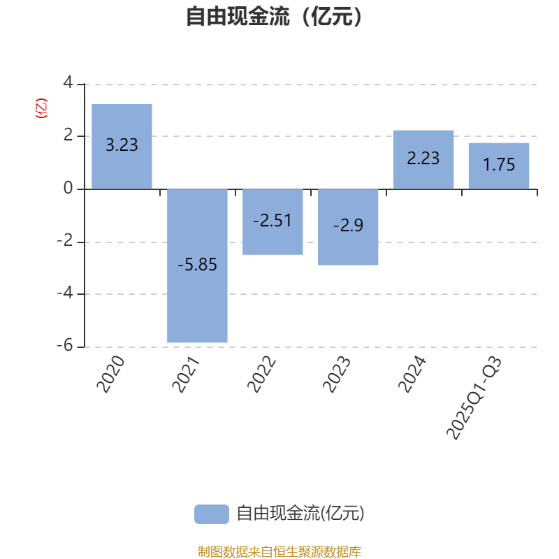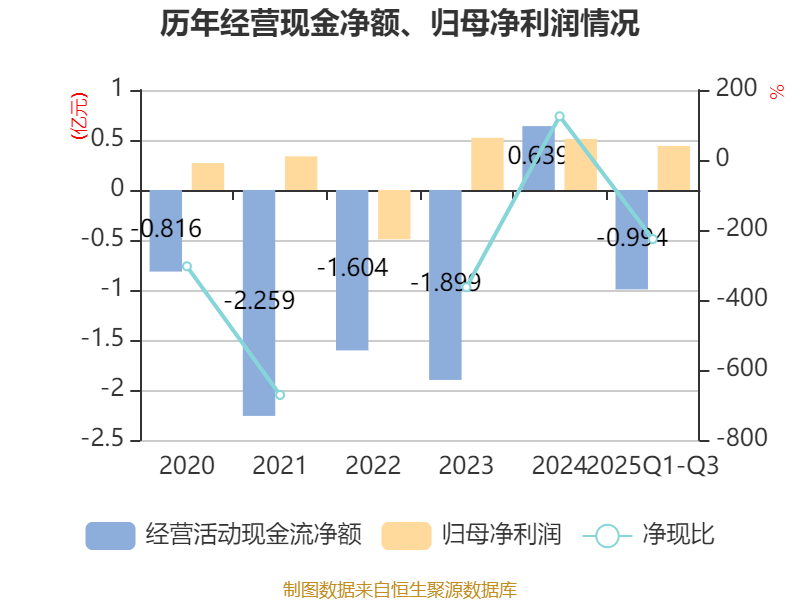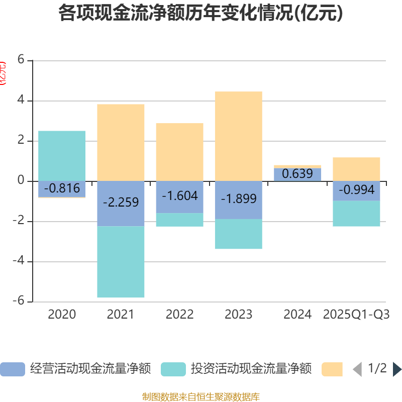 2025年前三季度,公司经营活动现金流净额为-9935.91万元,同比减少1.61亿元;筹资活动现金流净额1.17亿元,同比增加1.19亿元;投资活动现金流净额-1.27亿元,上年同期为2409.24万元。