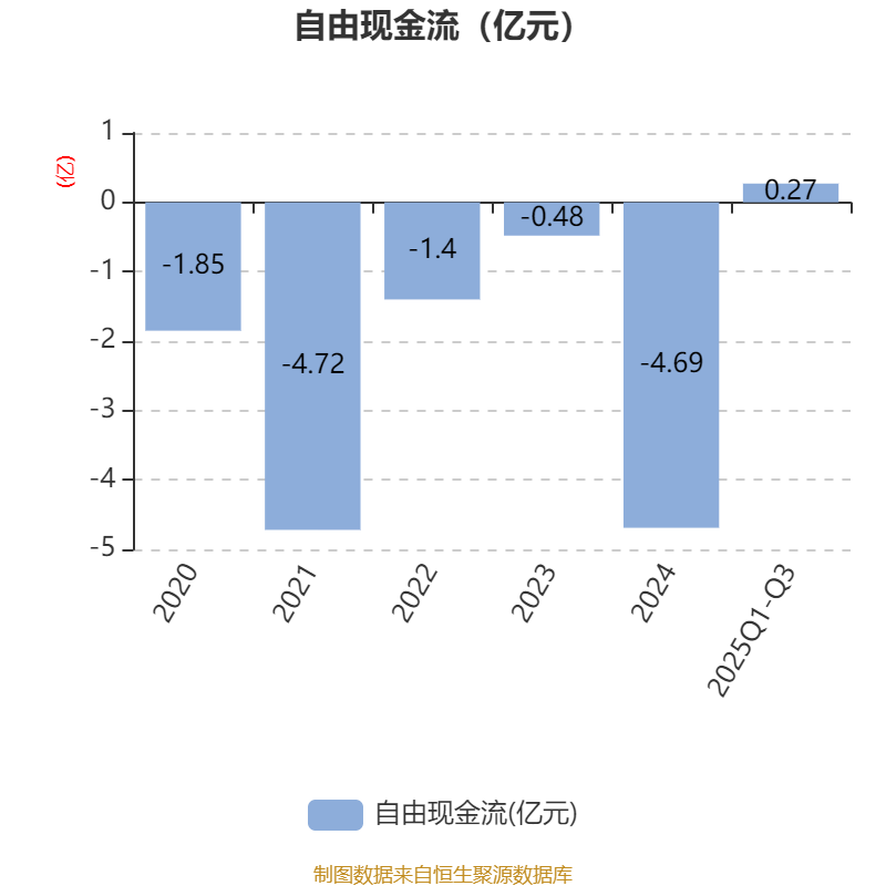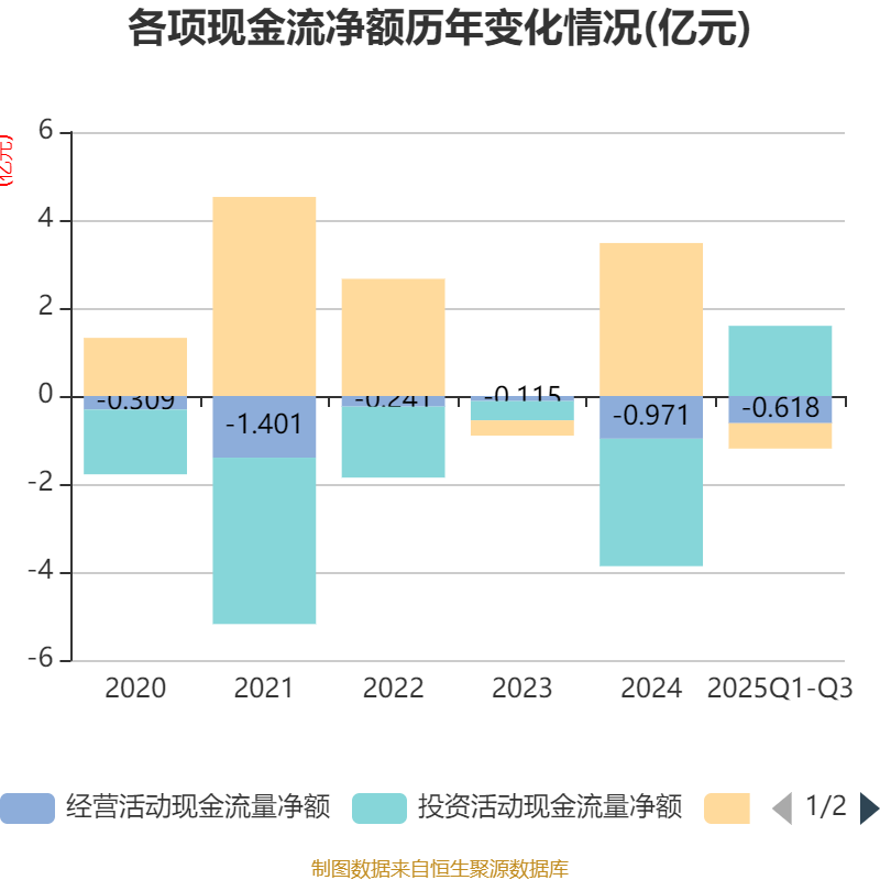 2025年前三季度,公司经营活动现金流净额为-6181.18万元,同比增加4597.87万元;筹资活动现金流净额-5766万元,同比减少4.33亿元;投资活动现金流净额1.59亿元,上年同期为-2.94亿元。