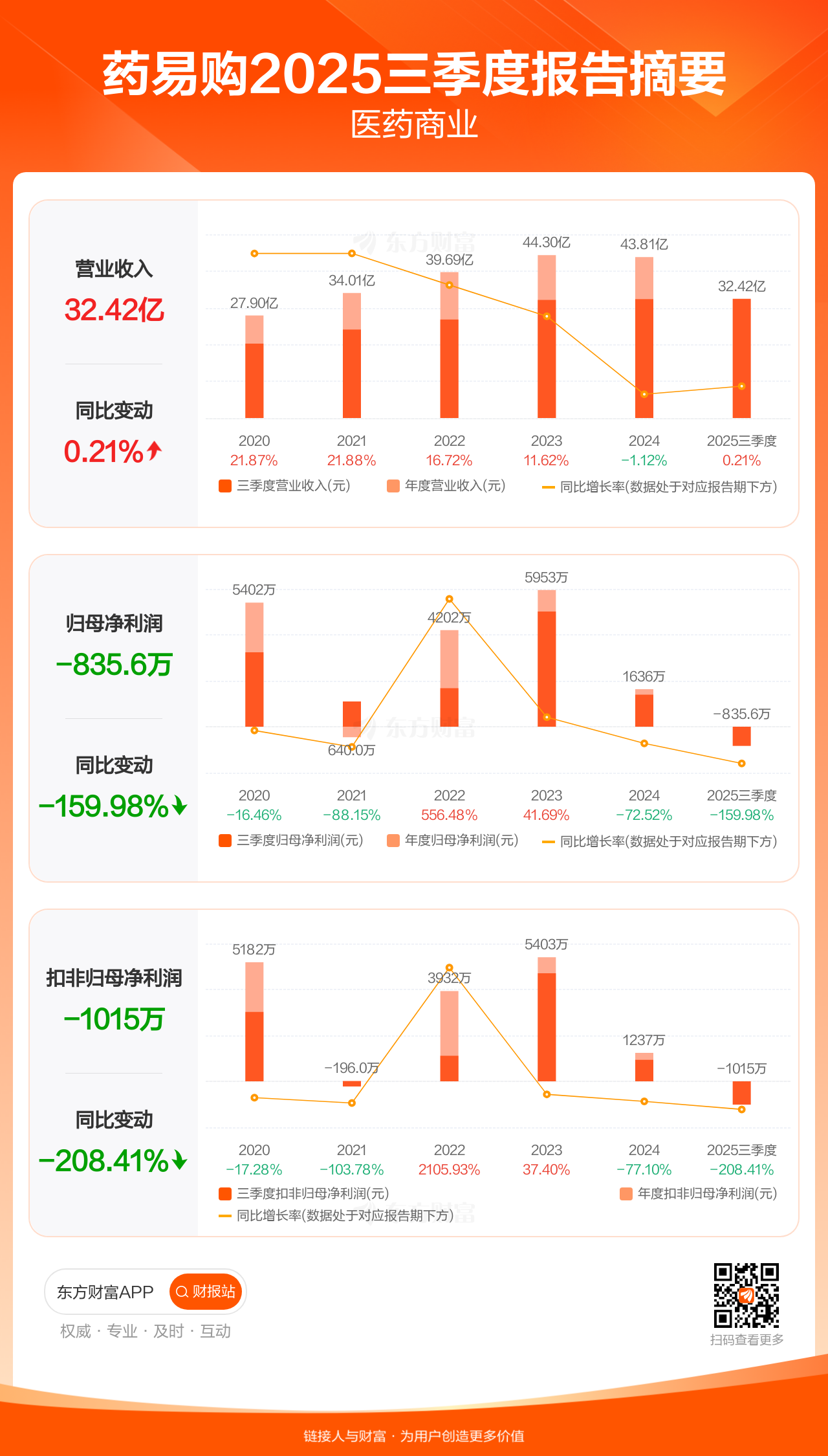 药易购10月24日发布2025年三季报显示,公司前三季实现营业收入32.42亿元,同比增长0.21%;归母净利润-835.65万元;扣非归母净利润-1015.26万元。每股EPS-0.09元,高于机构一致预测的null元。
