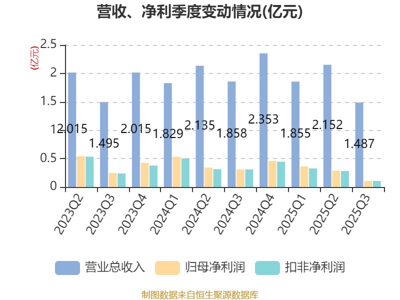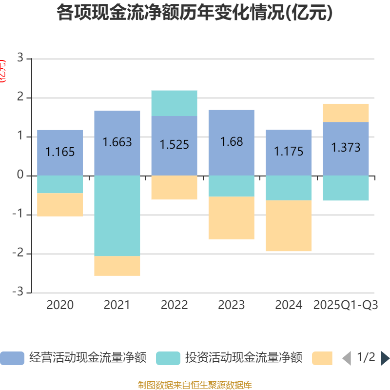 2025年前三季度,公司经营活动现金流净额为1.37亿元,同比增长40.84%;筹资活动现金流净额4645.58万元,同比增加1.78亿元;投资活动现金流净额-6408.01万元,上年同期为453.22万元。