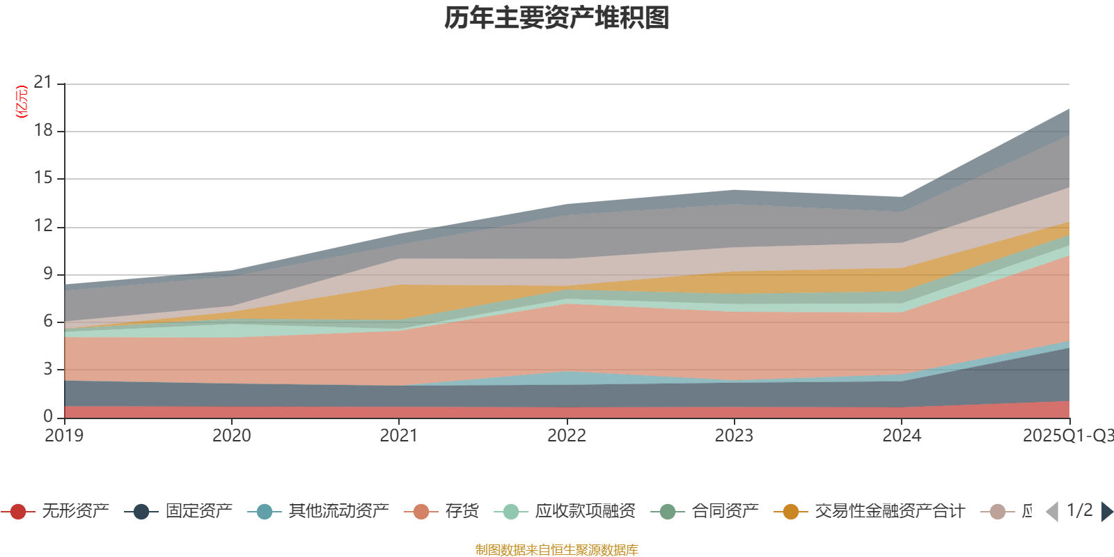 资产重大变化方面,截至2025年三季度末,公司交易性金融资产合计较上年末减少43.1%,占公司总资产比重下降6.26个百分点;固定资产较上年末增加104.37%,占公司总资产比重上升5.41个百分点;货币资金较上年末增加70.25%,占公司总资产比重上升3个百分点;商誉占公司总资产的2.35%,上年末为0。