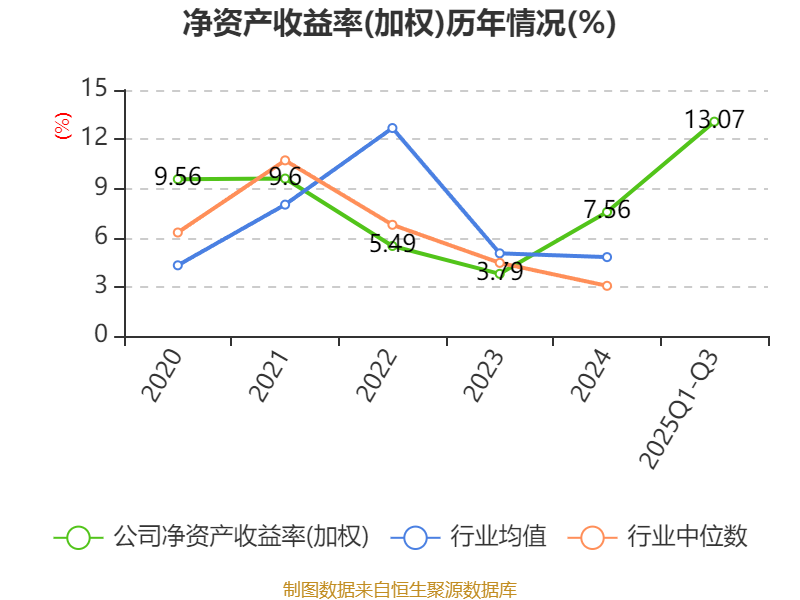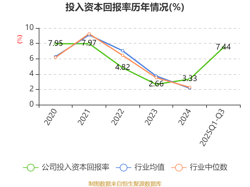 盈利能力方面, 2025年前三季度公司加权平均净资产收益率为13.07%,同比上升8.47个百分点。公司2025年前三季度投入资本回报率为7.44%,较上年同期上升5.2个百分点。