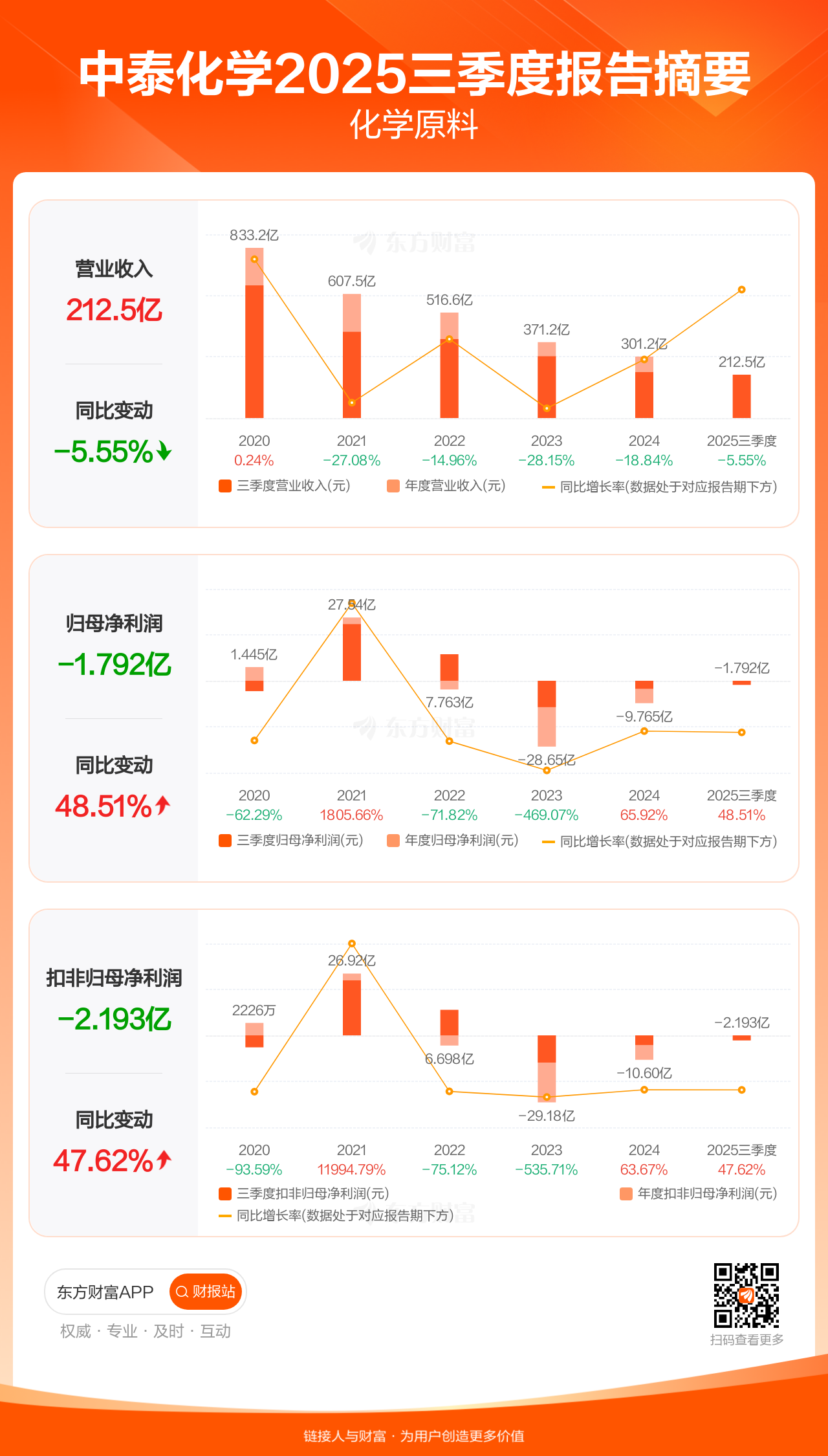 中泰化学10月24日发布2025年三季报显示,公司前三季实现营业收入212.46亿元,同比下滑5.55%;归母净利润-1.79亿元;扣非归母净利润-2.19亿元。每股EPS-0.07元,高于机构一致预测的null元。