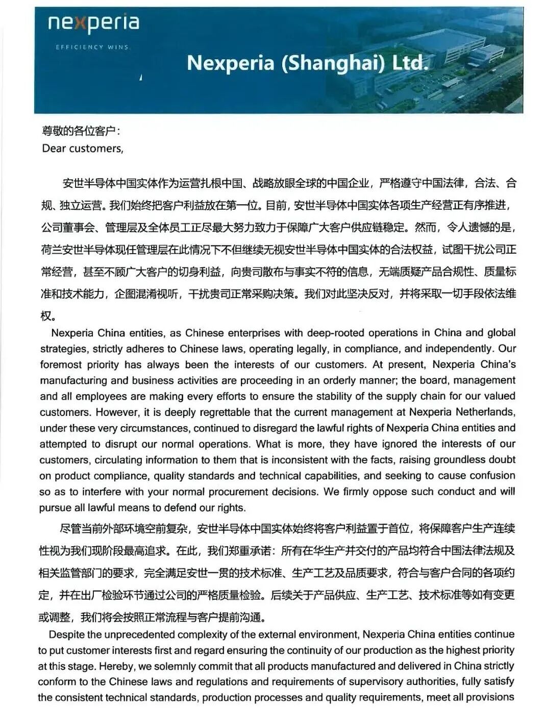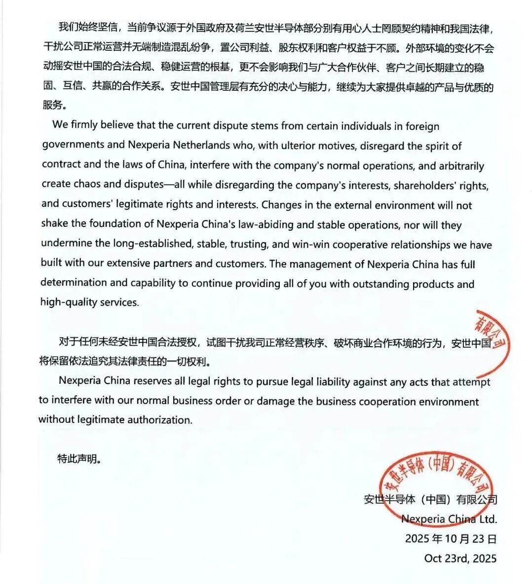 10月23日,安世半导体(上海)有限公司亦向客户发表声明称,荷兰安世半导体现任管理层无视安世半导体中国实体的合法权益,试图干扰公司正常经营,甚至不顾广大客户的切身利益,向贵司散布与事实不符的信息,无端质疑产品合规性、质量标准和技术能力,企图混淆视听,干扰贵司正常采购决策。