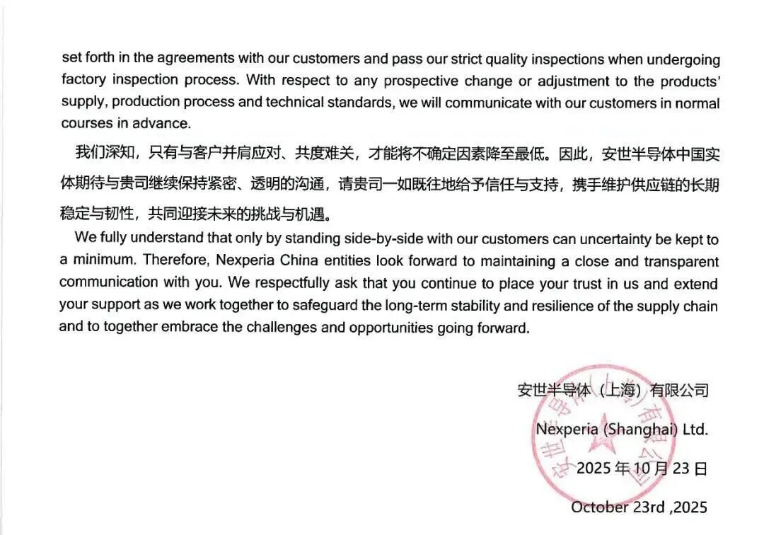 安世中国还表示,目前,安世中国所有业务活动、生产运营及对外合作均在法律与管理制度框架下有序、正常开展,不受任何外部单方面决定的影响。安世中国管理层有充分的决心与能力,继续提供卓越的产品与优质的服务。