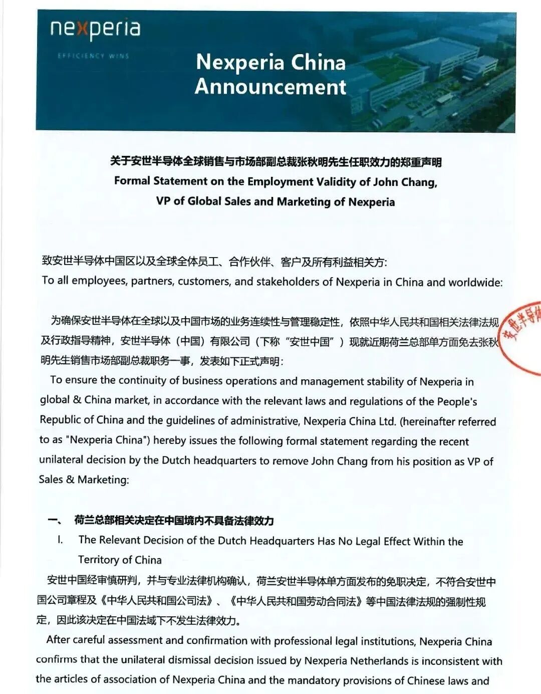 声明还表示,基于上述法律事实及中国劳动法的要求,张秋明的劳动合同并未被合法解除或变更,张秋明作为安世全球销售市场部副总裁的职务身份依然有效。他将继续履行此前的岗位职责,全权负责并领导安世全球(包括中国区)的全部销售运营、客户关系维护、供应链协调及日常经营决策。