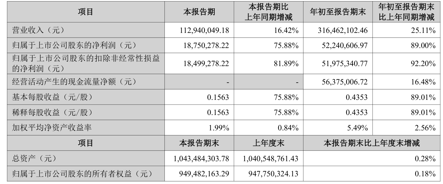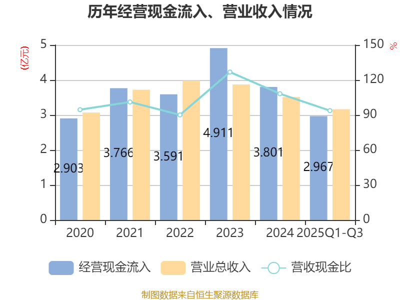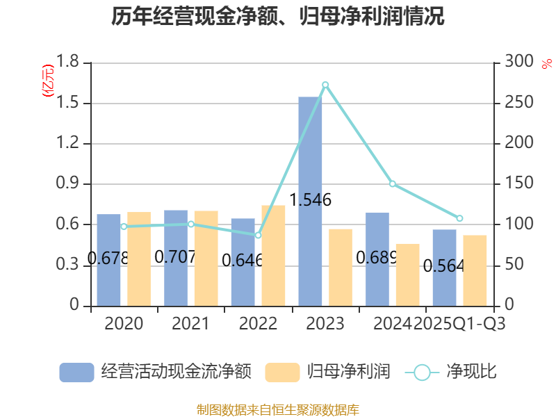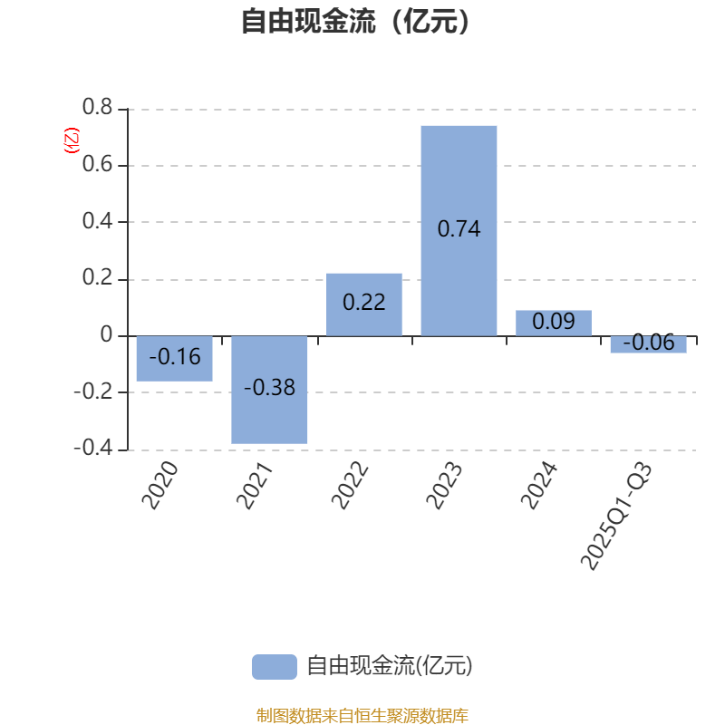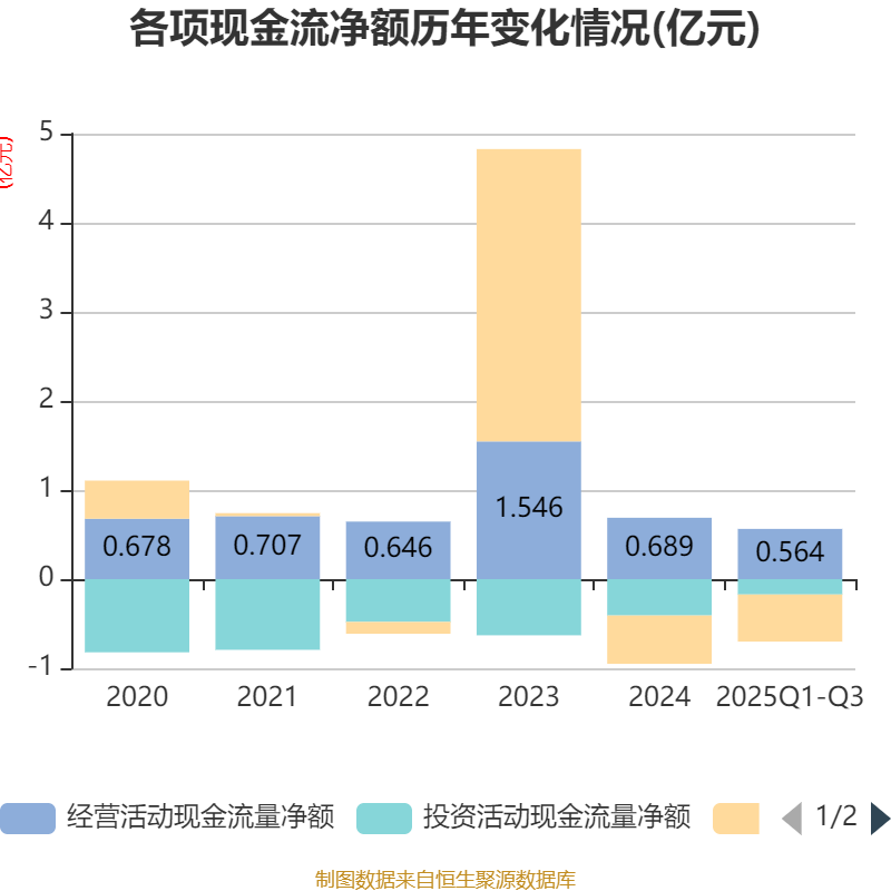 2025年前三季度,公司经营活动现金流净额为5637.5万元,同比增长16.48%;筹资活动现金流净额-5289.28万元,同比增加61.29万元;投资活动现金流净额-1720.7万元,上年同期为-3898.21万元。