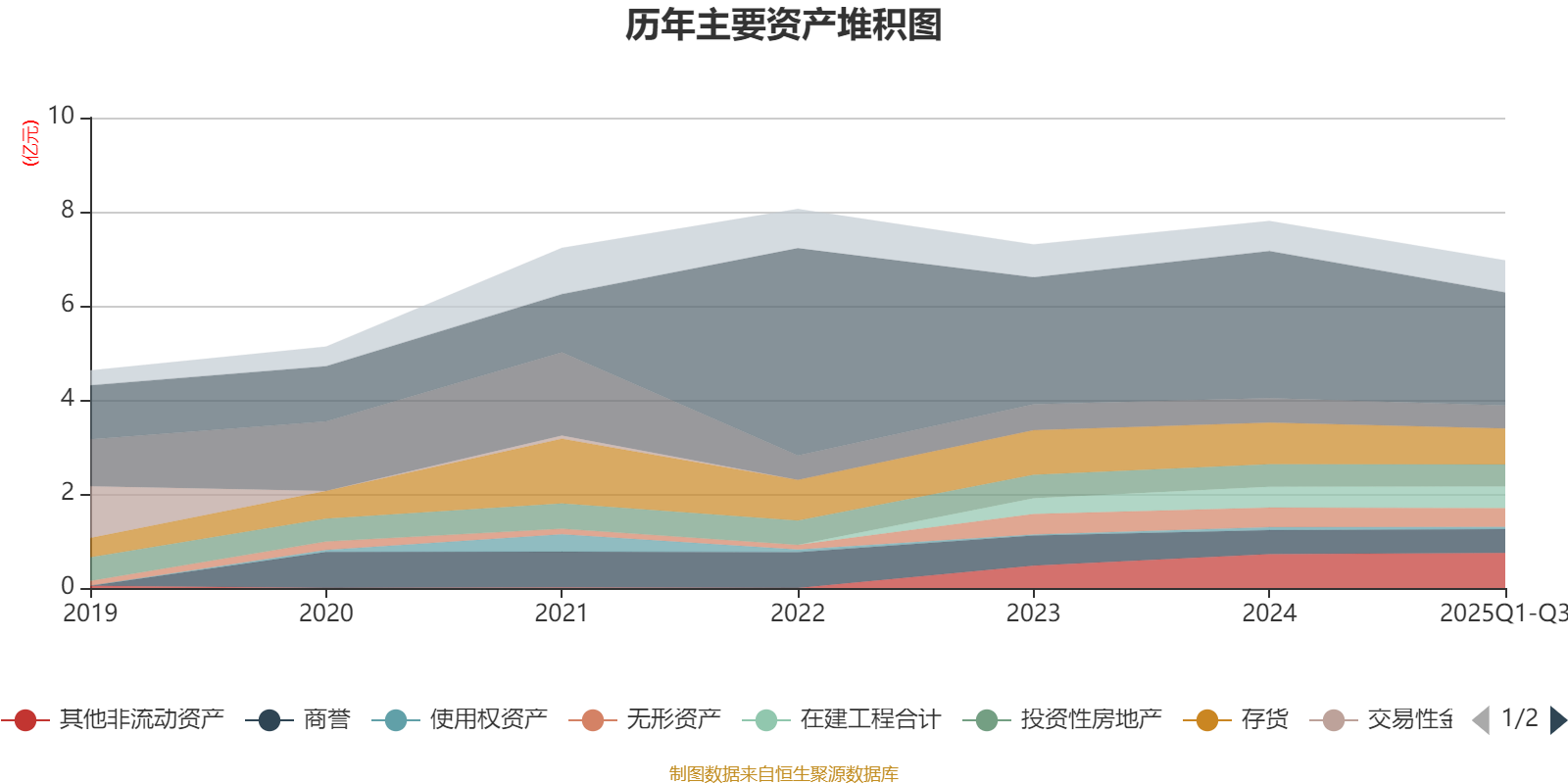 资产重大变化方面,截至2025年三季度末,公司货币资金较上年末减少23.16%,占公司总资产比重下降5.58个百分点;其他非流动资产较上年末增加3.04%,占公司总资产比重上升1.43个百分点;预付款项较上年末增加241.92%,占公司总资产比重上升1.29个百分点;在建工程合计较上年末增加3.37%,占公司总资产比重上升0.89个百分点。