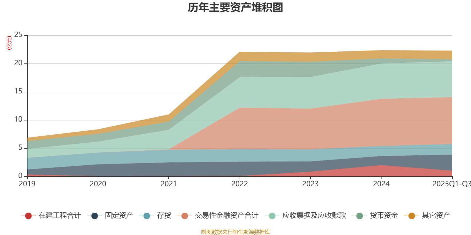 资产重大变化方面,截至2025年三季度末,公司固定资产较上年末增加77.5%,占公司总资产比重上升5.63个百分点;在建工程合计较上年末减少50.49%,占公司总资产比重下降4.42个百分点;货币资金较上年末减少60.96%,占公司总资产比重下降2.42个百分点;应收票据及应收账款较上年末增加1.39%,占公司总资产比重上升0.5个百分点。