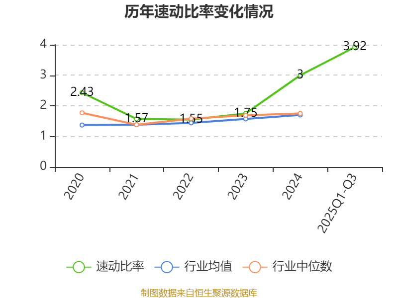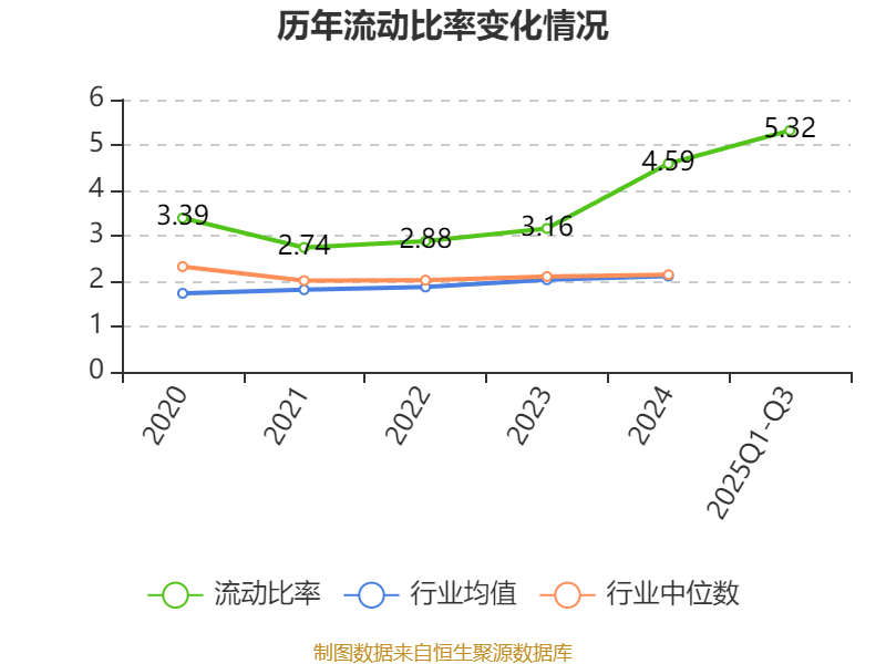 2025年前三季度,公司流动比率为5.32,速动比率为3.92。