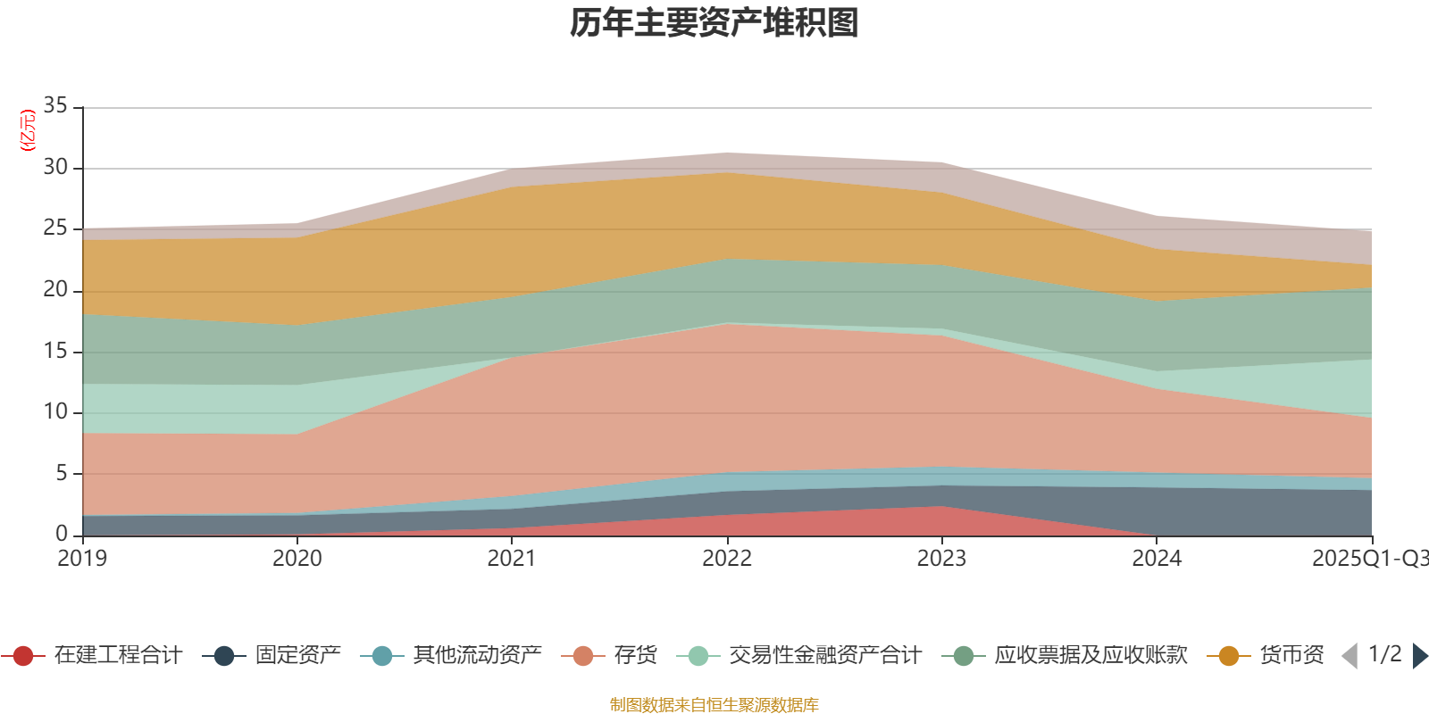 资产重大变化方面,截至2025年三季度末,公司交易性金融资产合计较上年末增加231.02%,占公司总资产比重上升13.67个百分点;货币资金较上年末减少56.46%,占公司总资产比重下降8.87个百分点;存货较上年末减少28%,占公司总资产比重下降6.39个百分点;应收票据及应收账款较上年末增加2.77%,占公司总资产比重上升1.74个百分点。