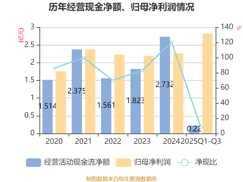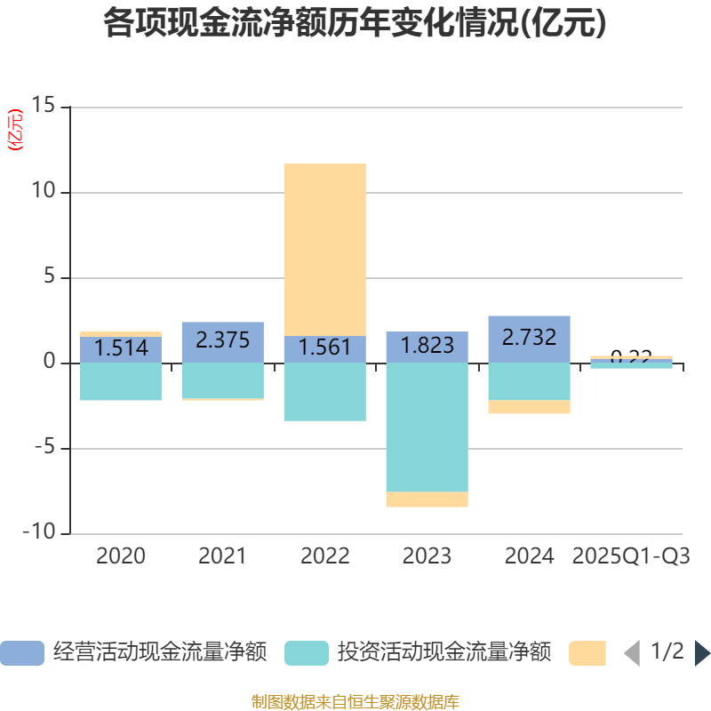 2025年前三季度,公司经营活动现金流净额为2201.04万元,同比下降89.05%;筹资活动现金流净额1721.3万元,同比增加2.11亿元;投资活动现金流净额-3463.72万元,上年同期为-6713.98万元。