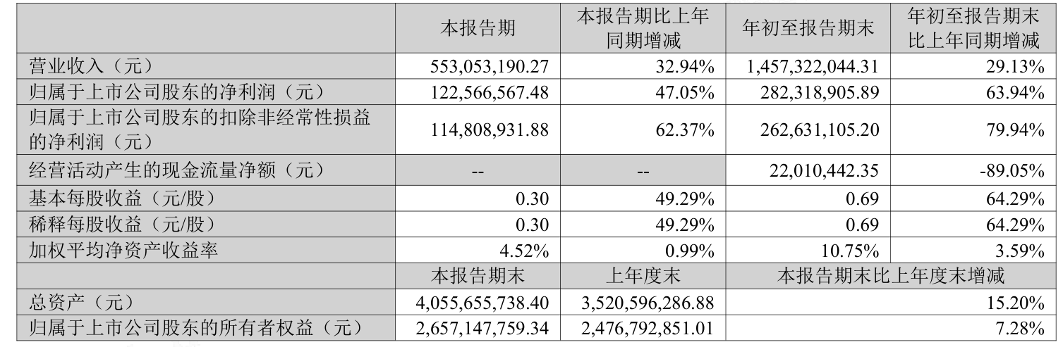 中证智能财讯鼎泰高科(301377)10月24日披露2025年第三季度报告。前三季度公司实现营业总收入14.57亿元,同比增长29.13%;归母净利润2.82亿元,同比增长63.94%;扣非净利润2.63亿元,同比增长79.94%;经营活动产生的现金流量净额为2201.04万元,同比下降89.05%;报告期内,鼎泰高科基本每股收益为0.69元,加权平均净资产收益率为10.75%。