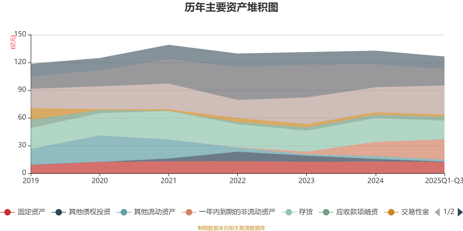 资产重大变化方面,截至2025年三季度末,公司一年内到期的非流动资产较上年末增加41.94%,占公司总资产比重上升5.76个百分点;货币资金较上年末减少28.81%,占公司总资产比重下降4.72个百分点;应收票据及应收账款较上年末增加16.45%,占公司总资产比重上升4.52个百分点;存货较上年末减少21.72%,占公司总资产比重下降3.45个百分点。