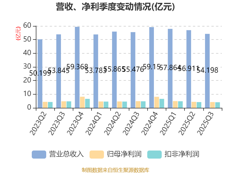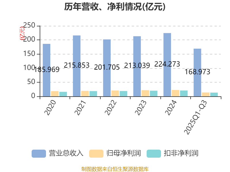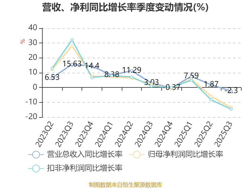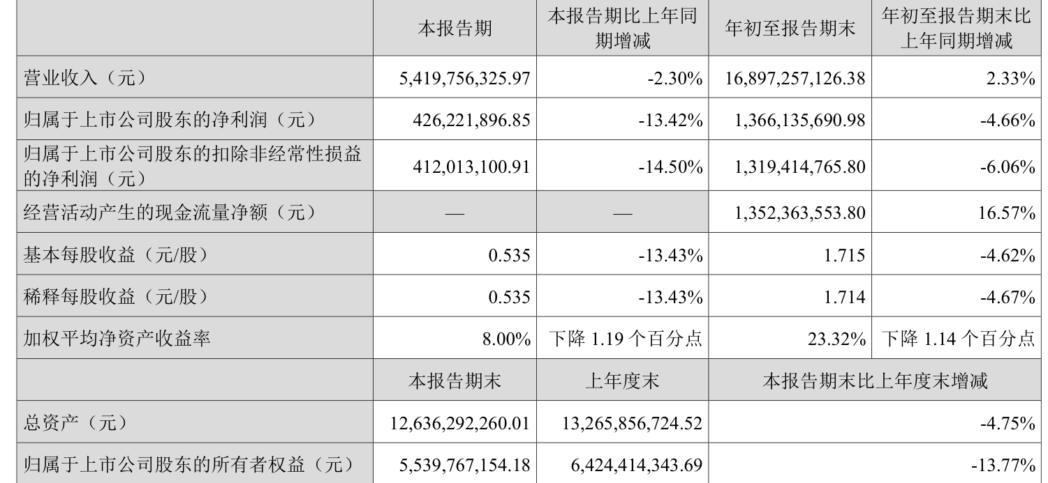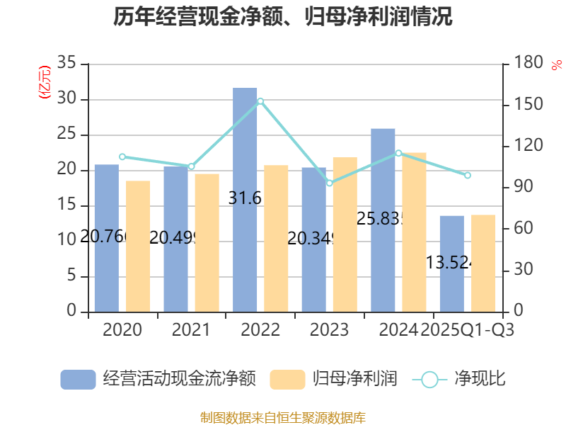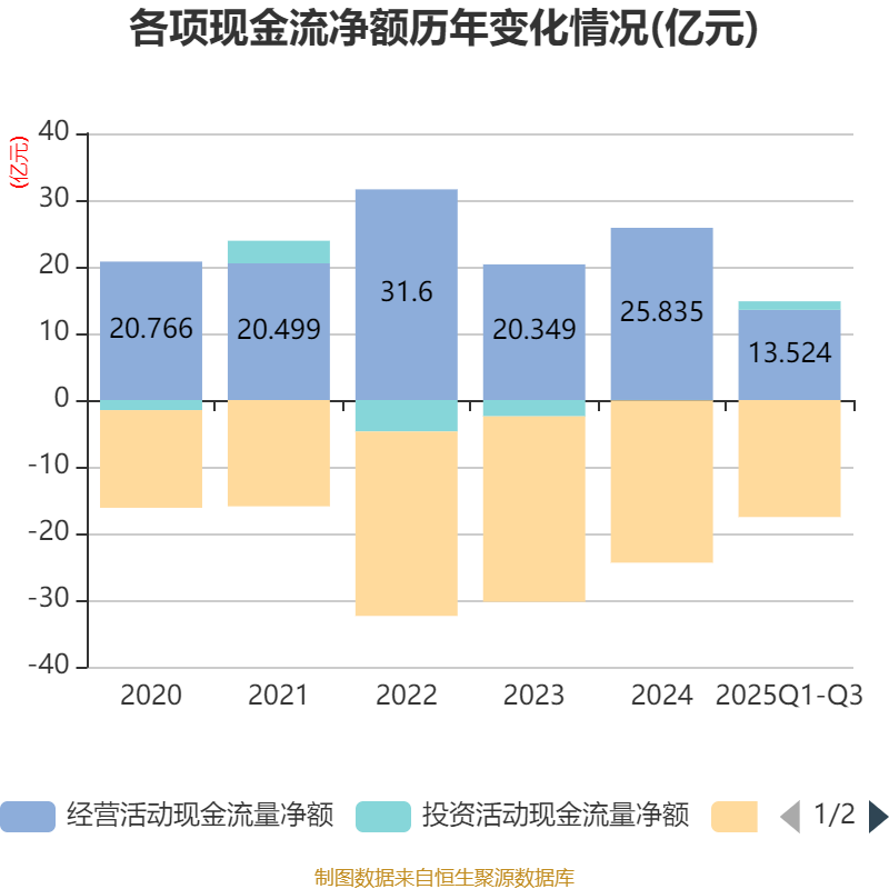 2025年前三季度,公司经营活动现金流净额为13.52亿元,同比增长16.57%;筹资活动现金流净额-17.54亿元,同比增加4.7亿元;投资活动现金流净额1.29亿元,上年同期为18.89亿元。