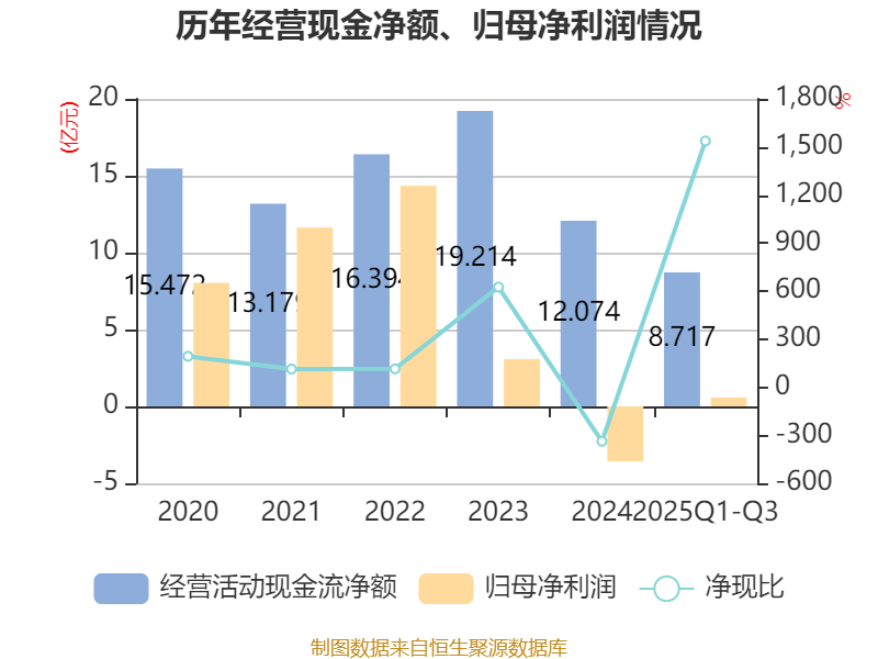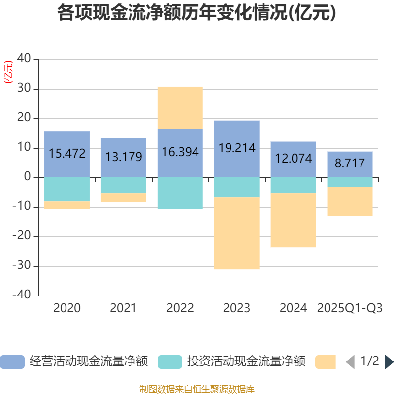 2025年前三季度,公司经营活动现金流净额为8.72亿元,同比增长1508.33%;筹资活动现金流净额-9.89亿元,同比增加3419.21万元;投资活动现金流净额-3.23亿元,上年同期为-6.23亿元。
