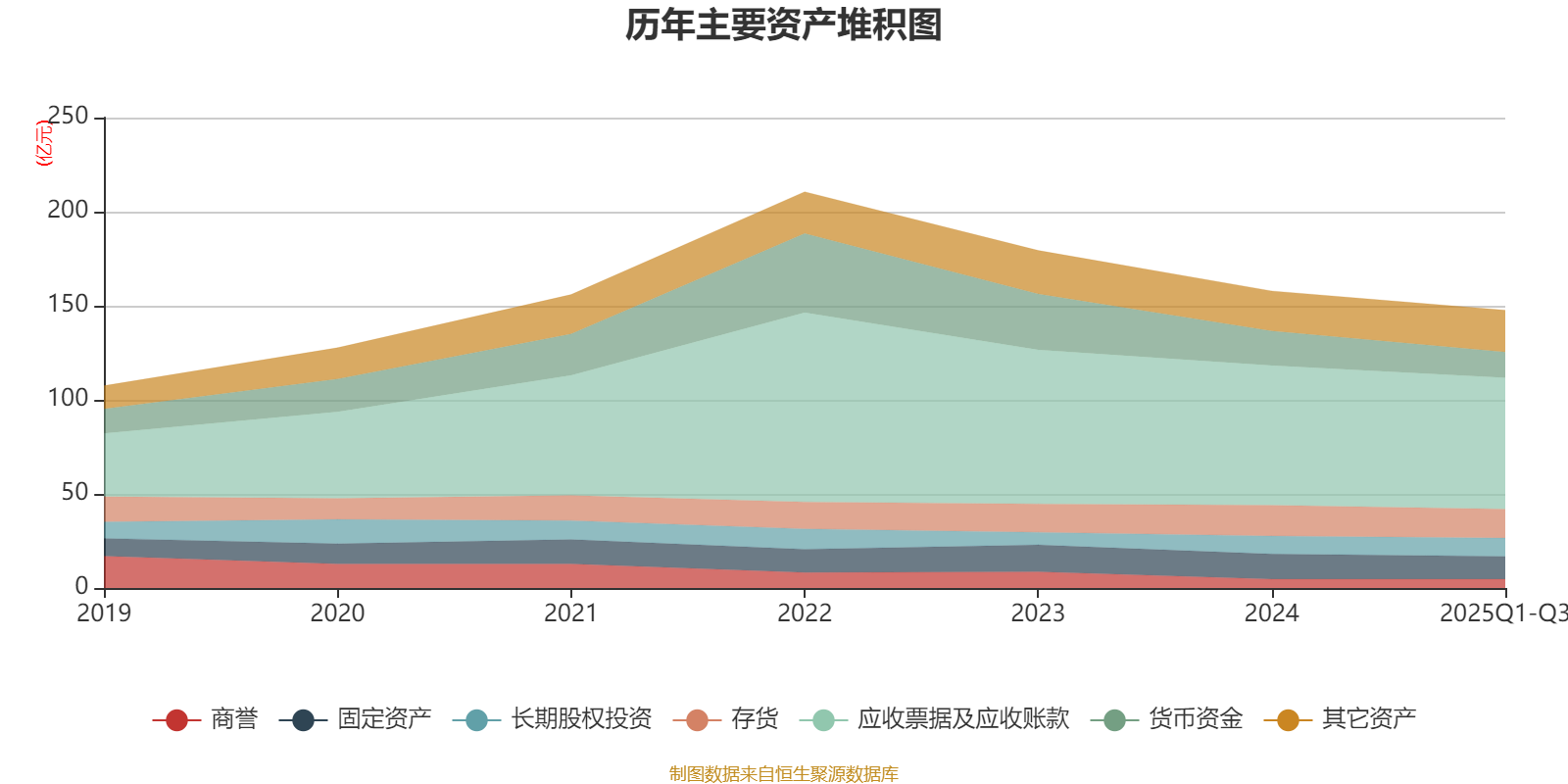 资产重大变化方面,截至2025年三季度末,公司货币资金较上年末减少25.03%,占公司总资产比重下降2.3个百分点;交易性金融资产合计较上年末增加32.49%,占公司总资产比重上升1.01个百分点;递延所得税资产较上年末增加17.18%,占公司总资产比重上升0.73个百分点;长期股权投资较上年末增加1.29%,占公司总资产比重上升0.5个百分点。