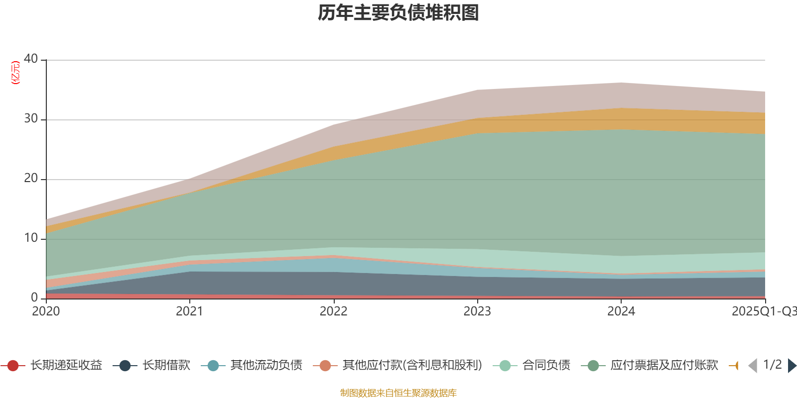 负债重大变化方面,截至2025年三季度末,公司应付票据及应付账款较上年末减少6.59%,占公司总资产比重下降2.5个百分点;其他流动负债较上年末增加44.7%,占公司总资产比重上升0.36个百分点;应付职工薪酬较上年末减少37.72%,占公司总资产比重下降0.33个百分点;长期应付款合计较上年末减少12.44%,占公司总资产比重下降0.31个百分点。