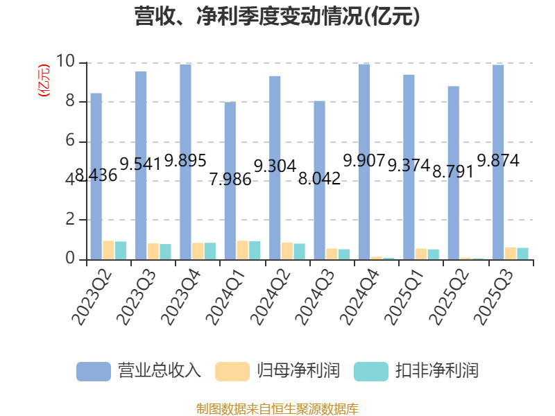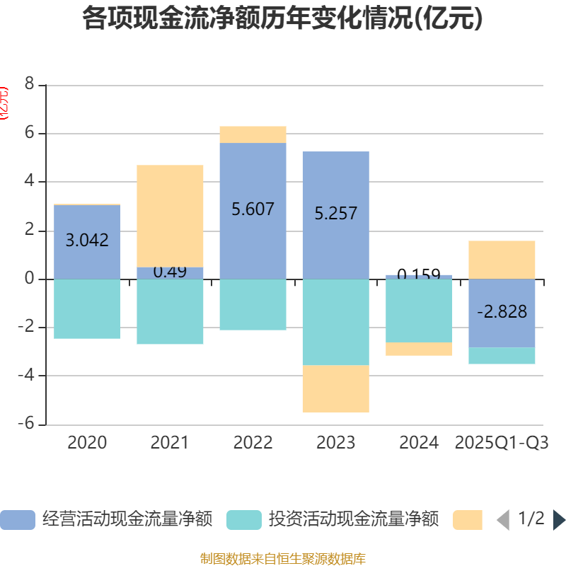 2025年前三季度,公司经营活动现金流净额为-2.83亿元,同比增加9250.65万元;筹资活动现金流净额1.57亿元,同比增加1.7亿元;投资活动现金流净额-6771.18万元,上年同期为-2.21亿元。