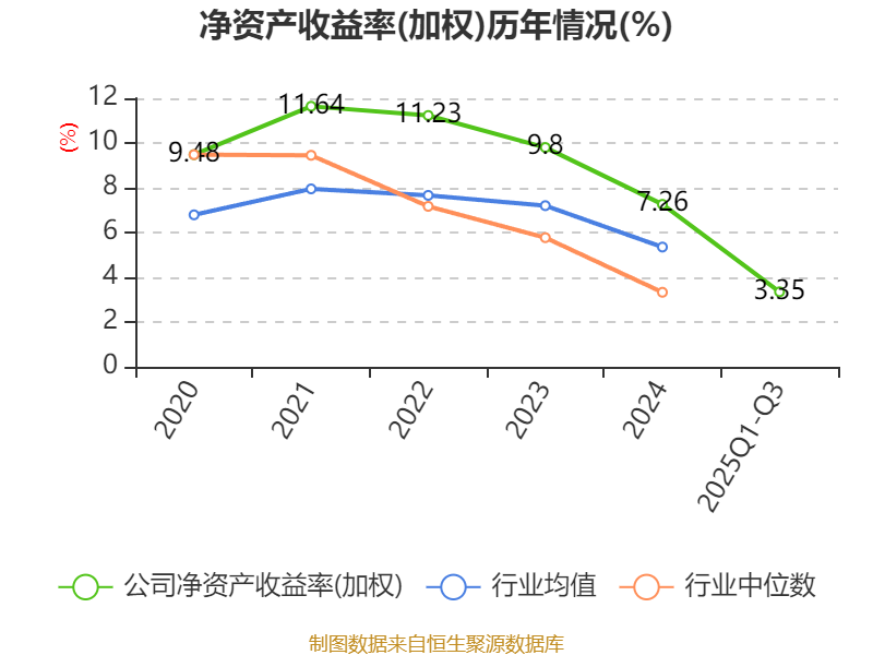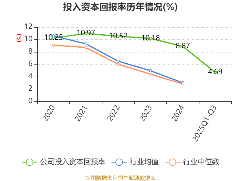 盈利能力方面, 2025年前三季度公司加权平均净资产收益率为3.35%,同比下降3.47个百分点。公司2025年前三季度投入资本回报率为4.69%,较上年同期下降2.77个百分点。