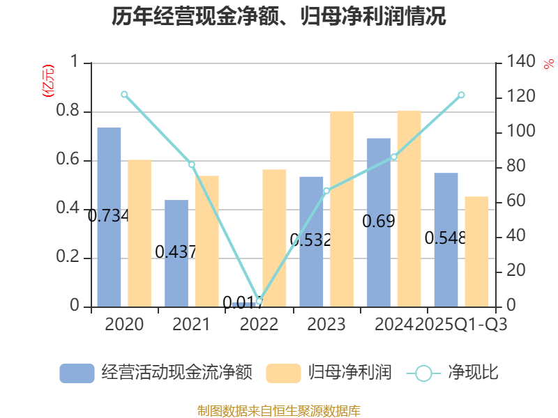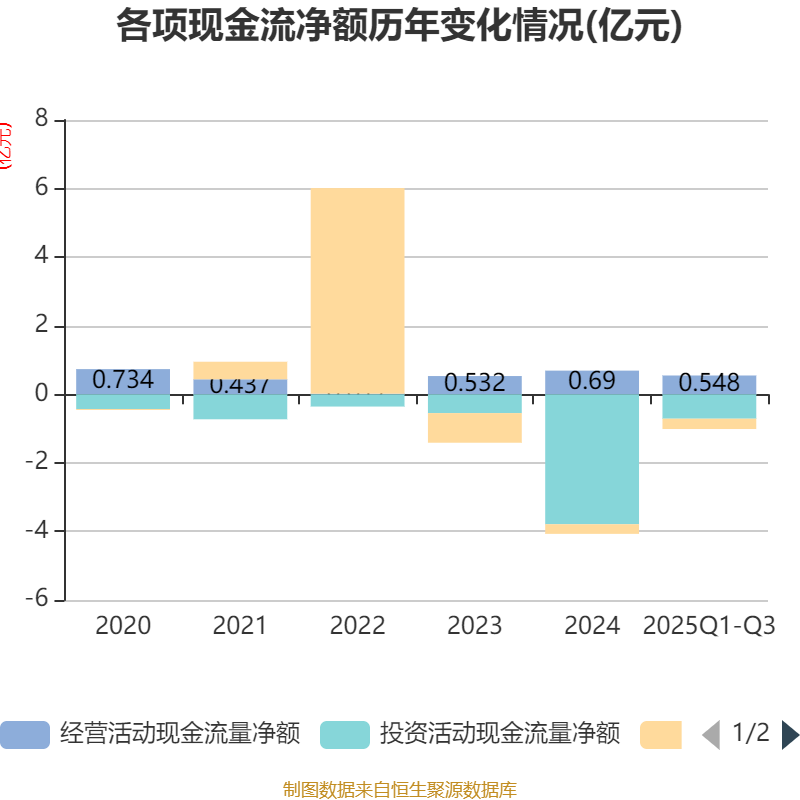 2025年前三季度,公司经营活动现金流净额为5478.2万元,同比下降0.61%;筹资活动现金流净额-3007.65万元,同比减少207.65万元;投资活动现金流净额-7116.71万元,上年同期为-4.59亿元。